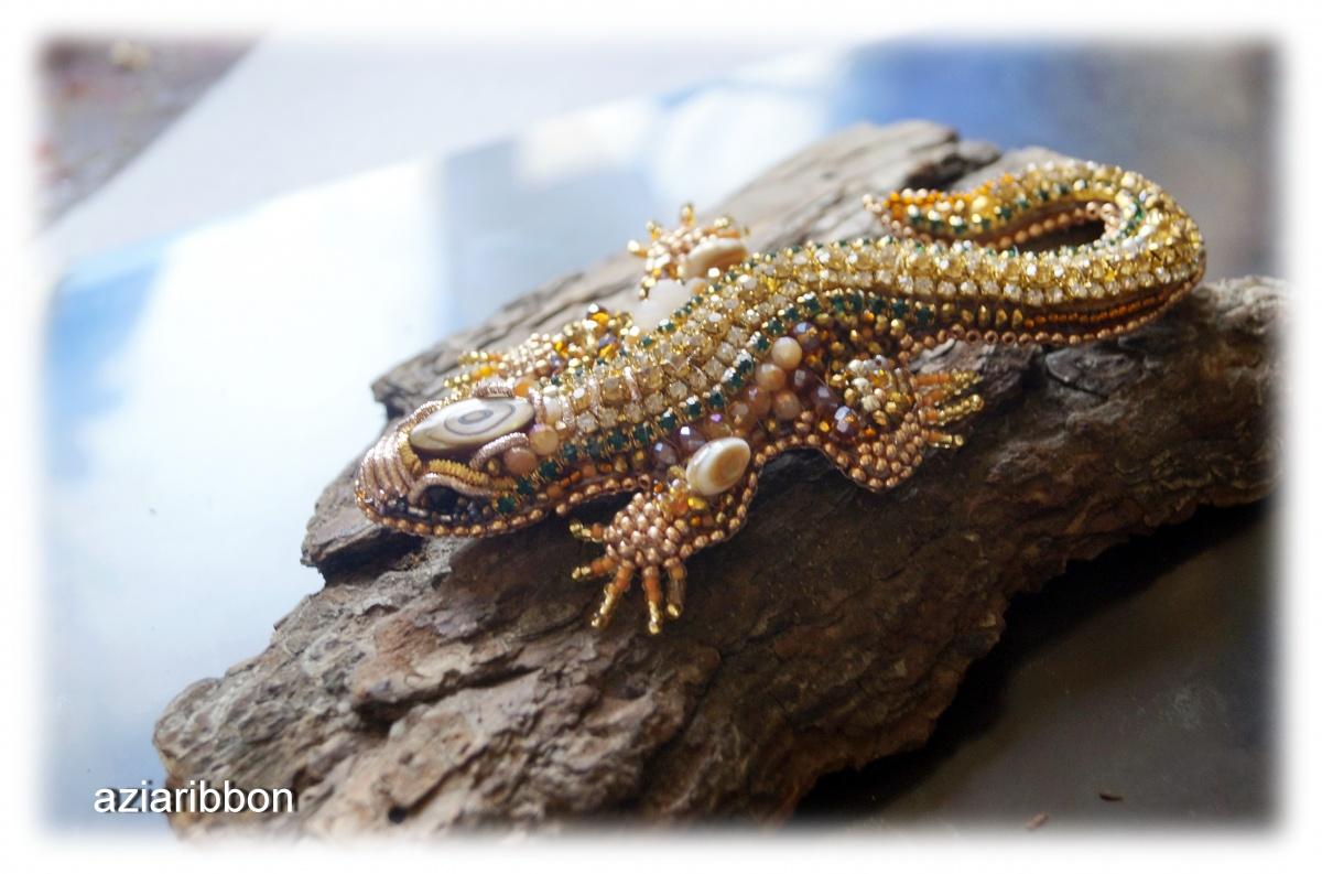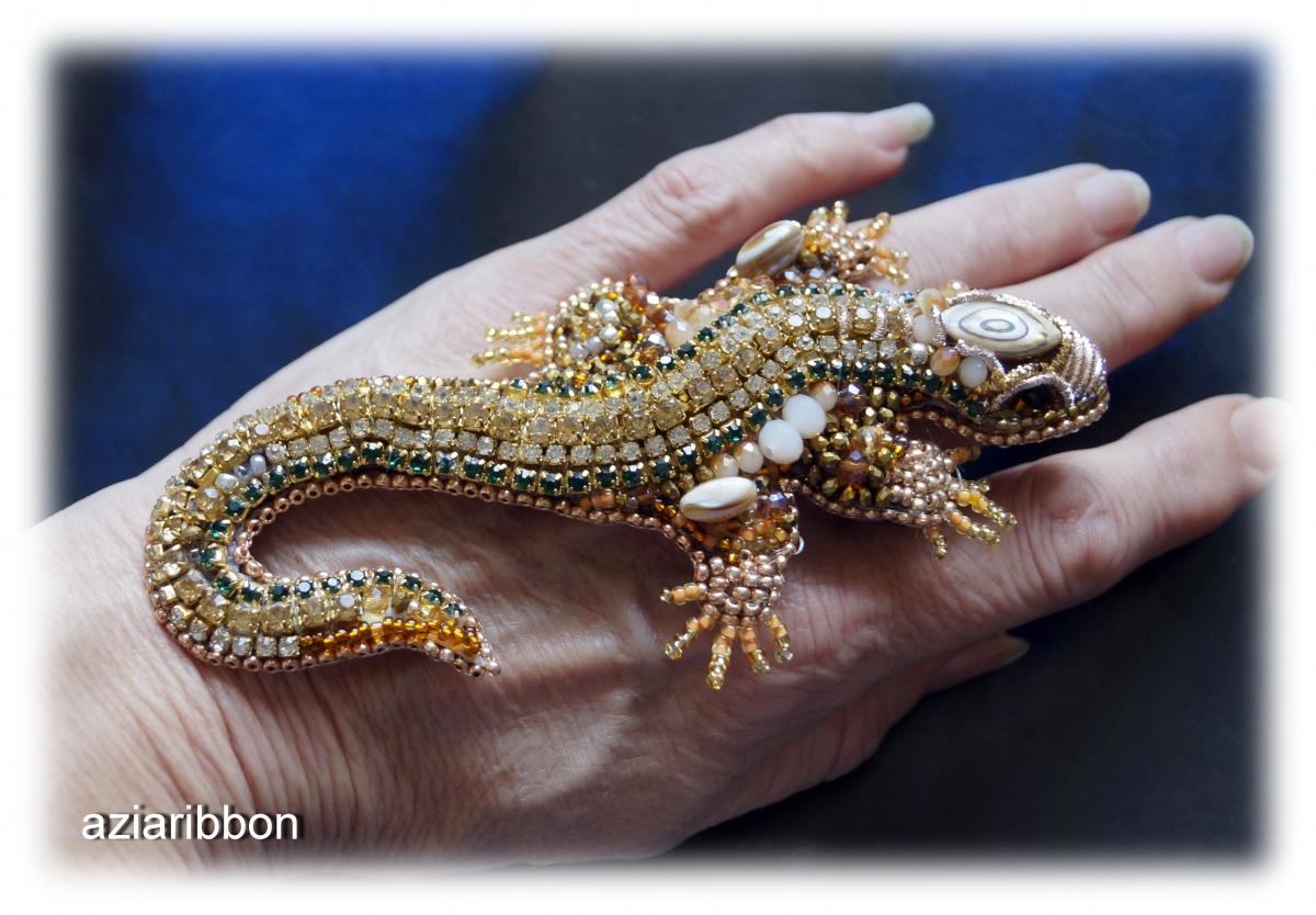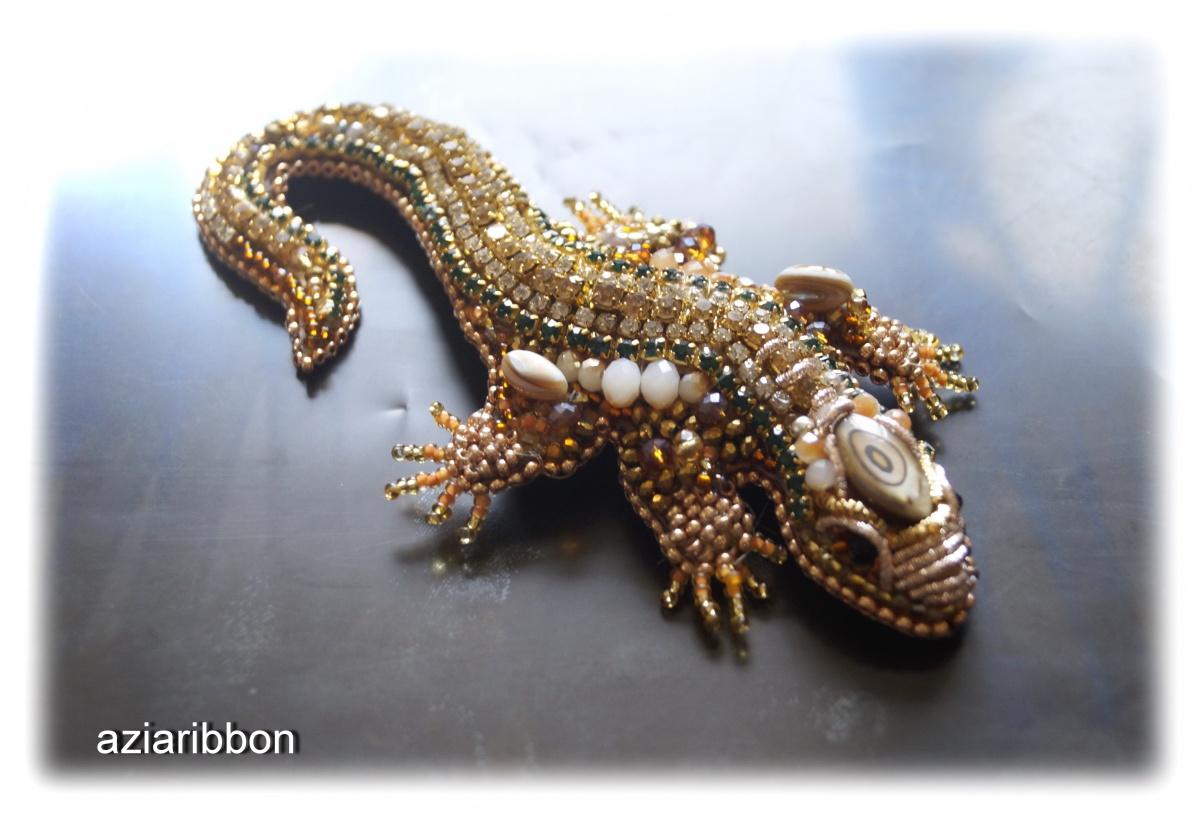 К тому же меня вдруг посетило озарение, что тема ящериц в моем творчестве раскрыта как-то однобоко… То бишь кожаных-то ящеров я ваяю, а вот бисерного не сделала ни одного. Решила восполнить пробел. Цветовую гамму выбрала свою любимую — золото с коричневыми оттенками и каплей зелененького. Был бы у меня зеленый бисер, то и зелени было бы на несколько капель больше, да
