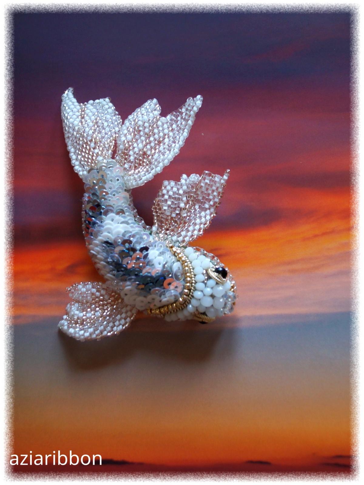 Плела бисером матсуно прозрачным и белым с добавлением пятнашки тохо. Когда плавники и хвост были готовы, из фетра оформила тельце рыбы.