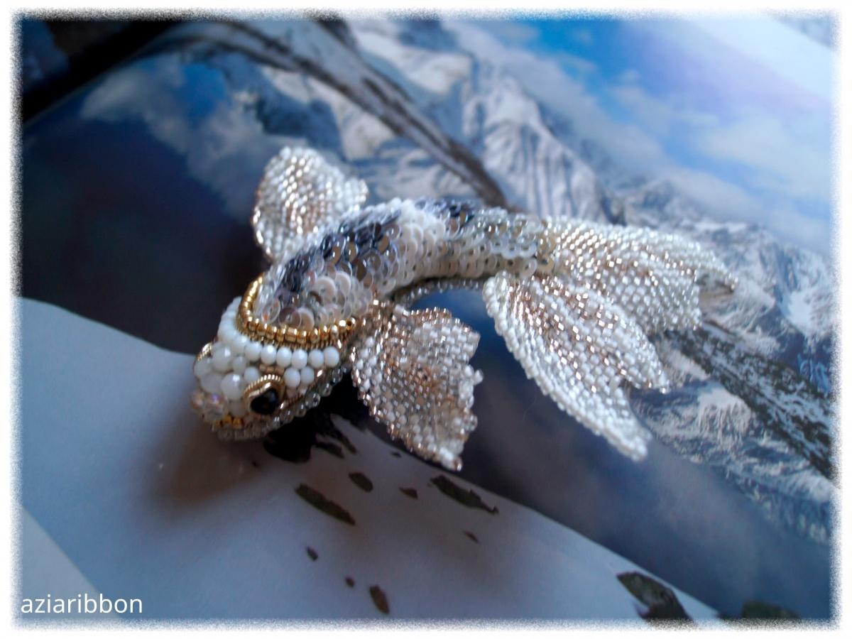 Не такая уж она и серебряная, но чешуя местами отливает серебром, да… Вообще-то хотела сделать целиком белой. Была уверена, что добавляемая мной в плавники пятнашка, тоже белая))) При дневном свете выяснилось, что я глубоко заблуждалась))) Да, и серебряный бисер, отделяющий голову с жабрами от тела, тоже оказался золотым)))