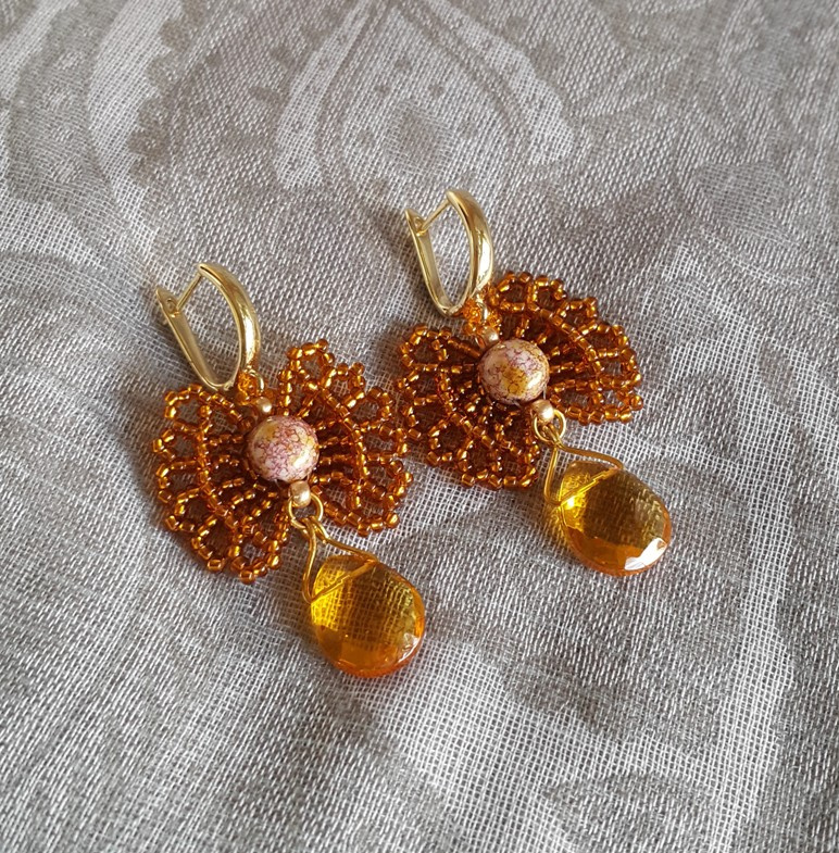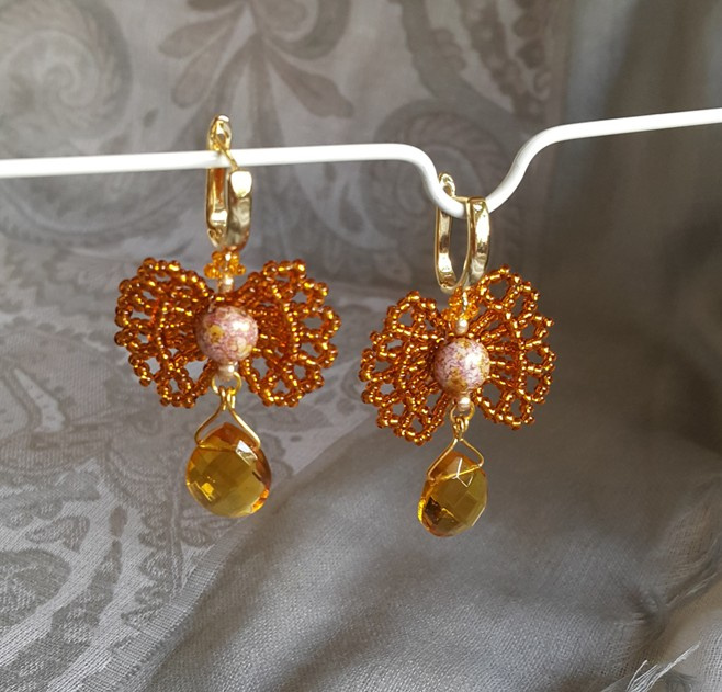 К своему ажурному ожерелью под янтарь сплела бисерные серьги-бабочки, как реплику на олонецкие жемчужные сережки.