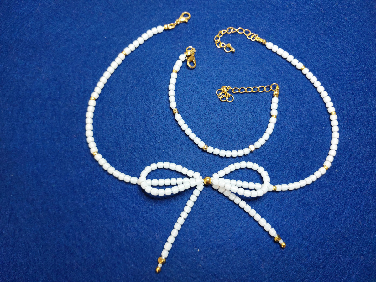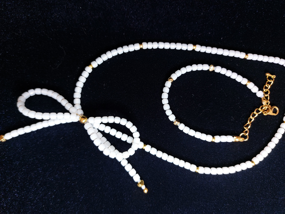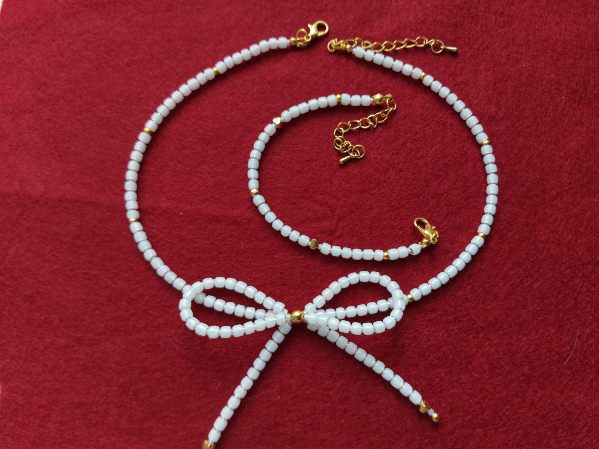 Дочка попросила сделать ей чокер с бантиком. Оказывается, популярная вещица у молодежи. Сначала хотела сделать из натурального жемчуга, но подходящего размера мы с ней не подобрали. Остановились на бисере Тохо 6 молочно-белого цвета.