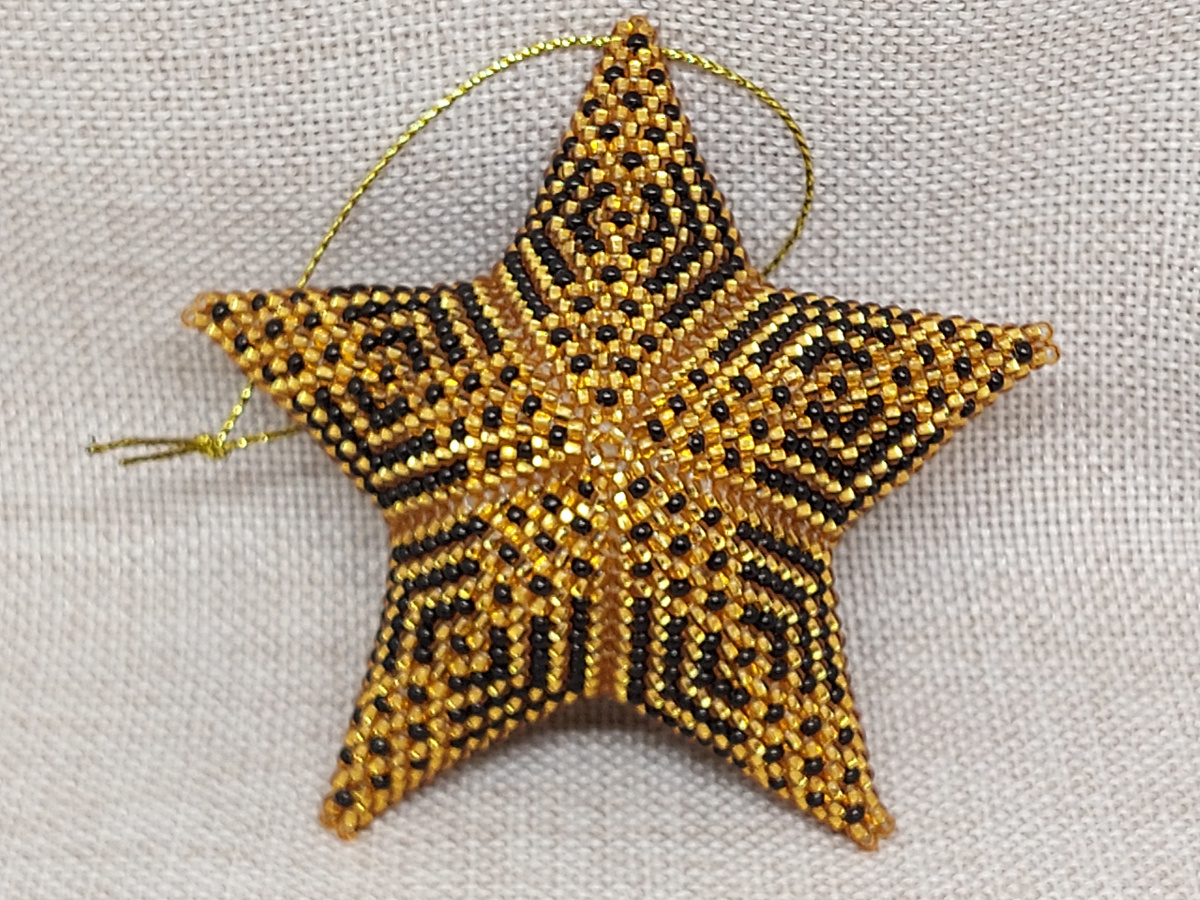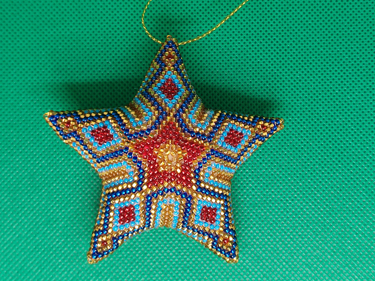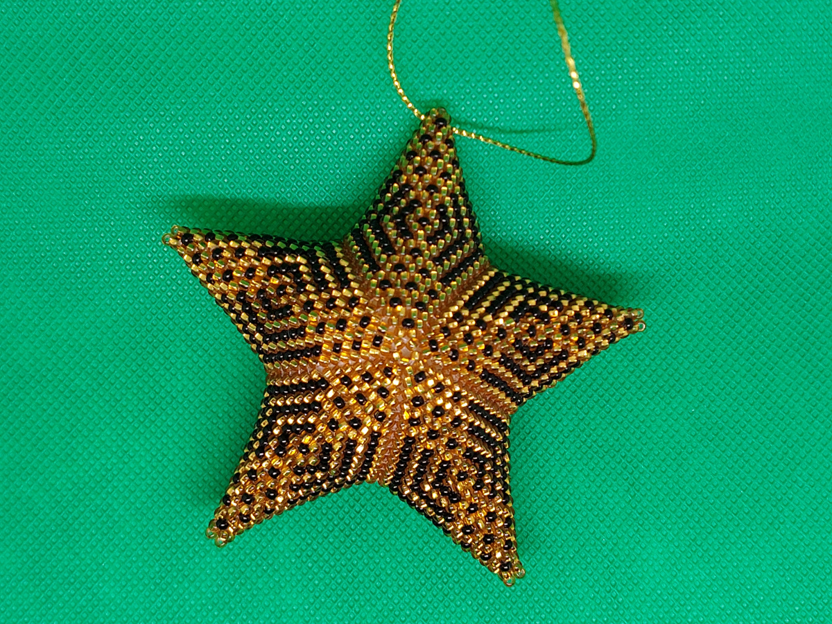 И еще одна — по образцу из интернета. Схему нарисовала с фотографии готовой звездочки. Золотистый бисер с квадратным отверстием, на свету красиво играет. но свою елочку не дождалась, уехала на подарок.