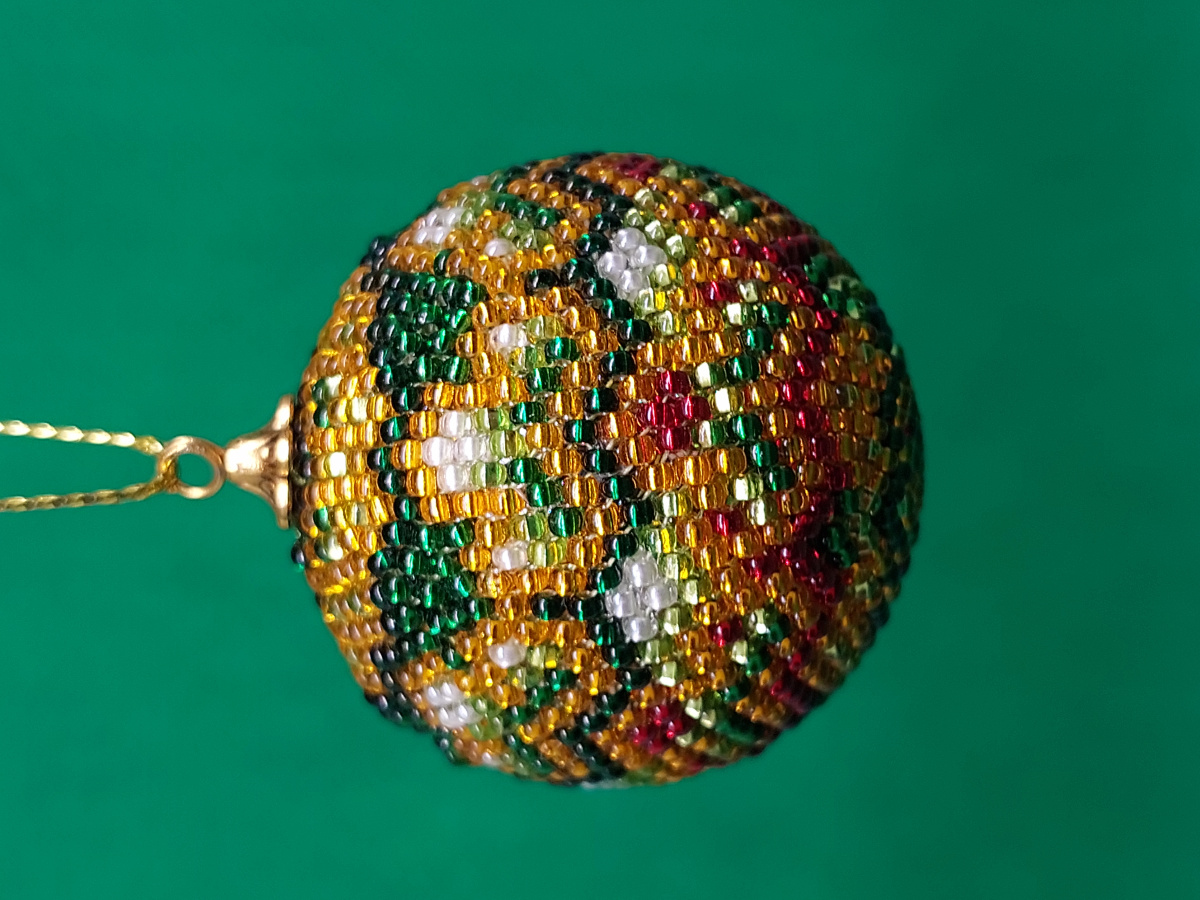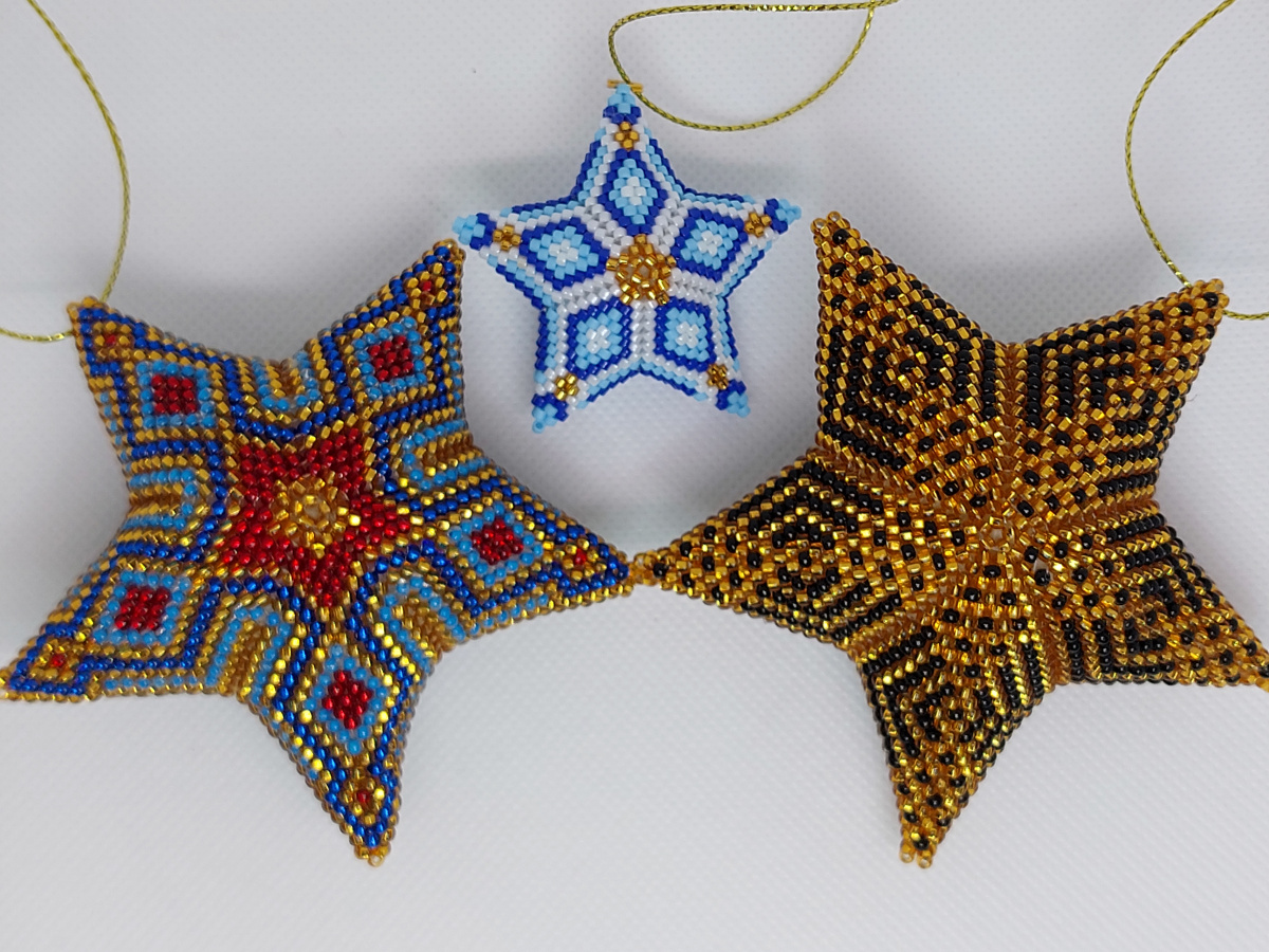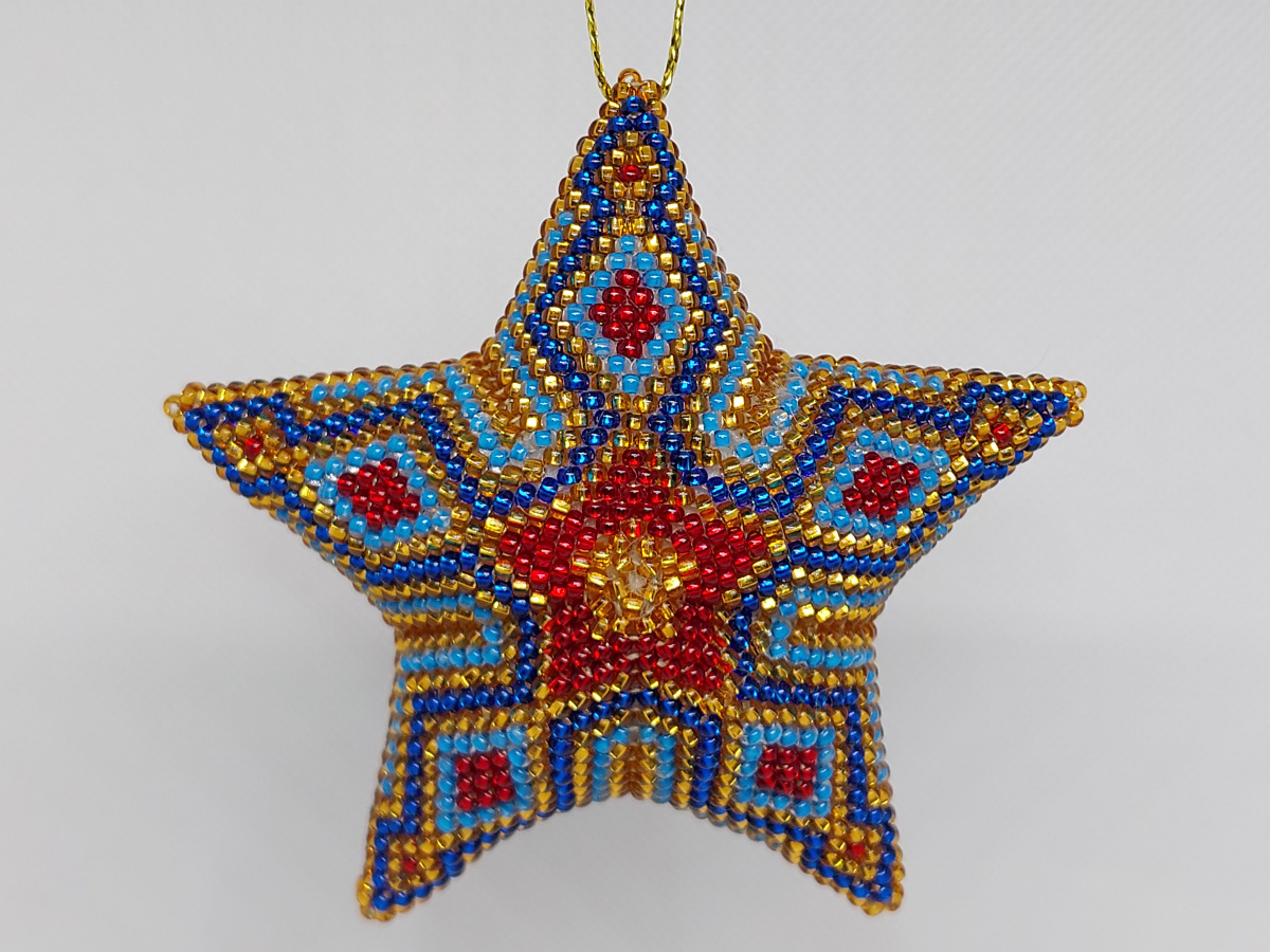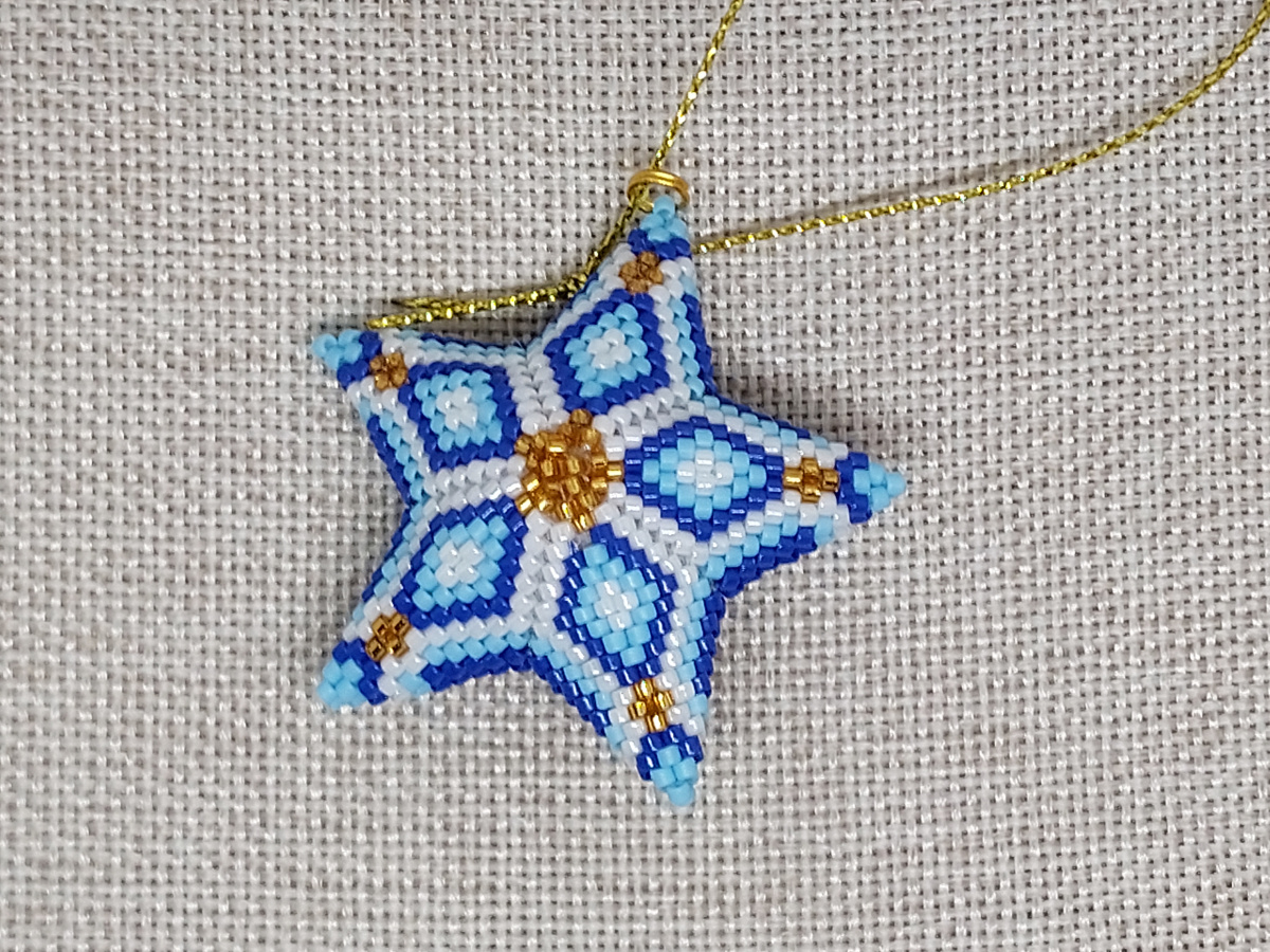 И еще одна — по образцу из интернета. Схему нарисовала с фотографии готовой звездочки. Золотистый бисер с квадратным отверстием, на свету красиво играет. но свою елочку не дождалась, уехала на подарок.