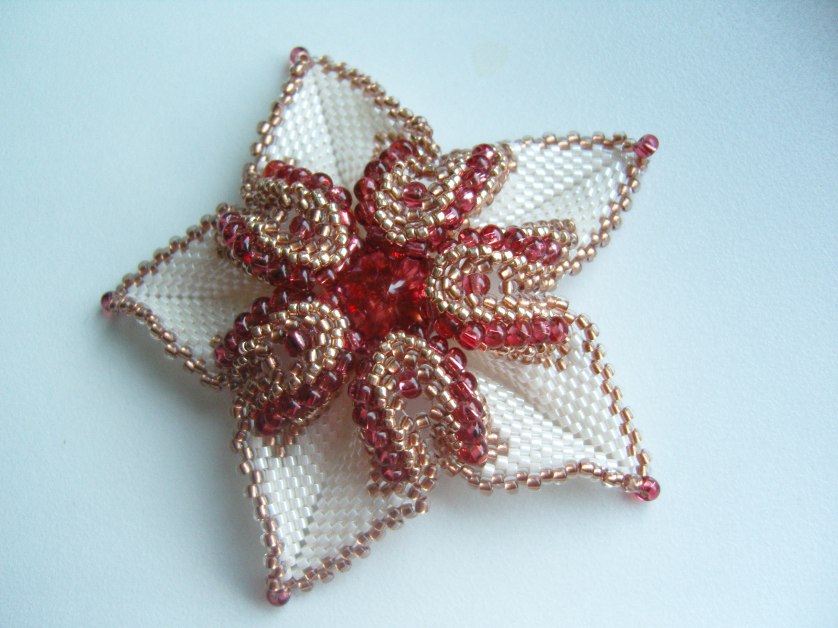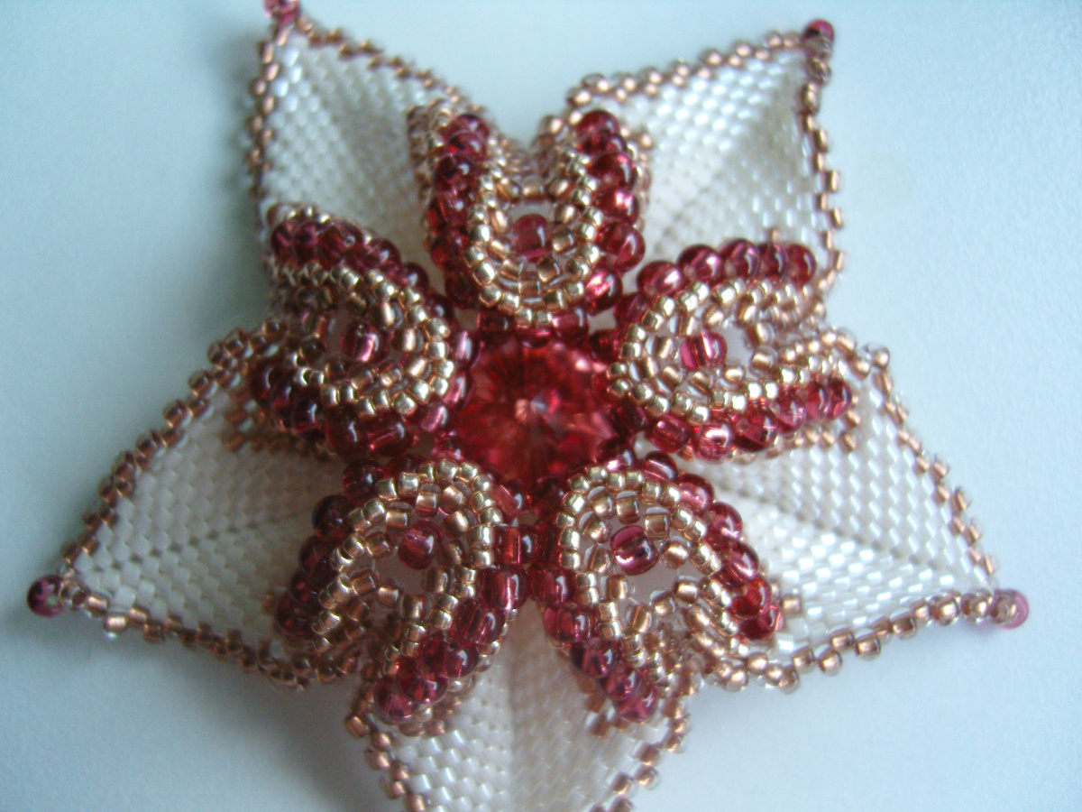 Думаю, эта звёздочка подойдёт на нашу ёлку, схемку составляла Татьяна Проффен (tanik).Плести лучше на прочной нити, Начинаем с 10 бис. делики, обозначим вершины и плетём мозаикой с прибавкой в лучах ндебеле 7 рядов, с 8-го ряда по схеме Тани.