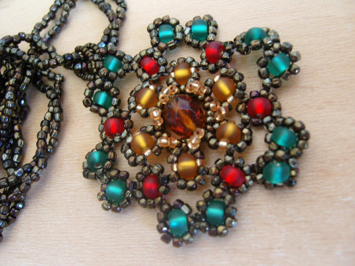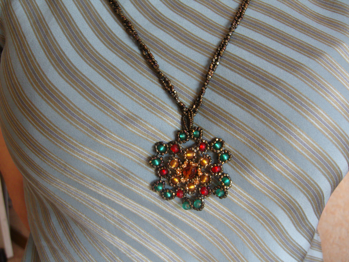 Принесла мне как-то ученица старые ненужные бабушкины бусы, я так обрадовалась! Старинный чешский гранёный бисер так переливается, влюбилась в него! И бисер крупный чешский матовый 6-ка сюда хорошо вписался, тоже лежал много лет, ждал своего часа. Цепочку сделала простой, хотела внимание акцентировать на кулоне, две низки просто перекручиваются.Два раза можно вокруг шеи, или три, по желанию.