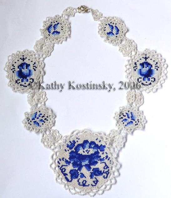 Увлеклась я в 2006 году плетением гжельских кружочков, потом забросила это, остановившись на одном гердане, а потом решила из неиспользованного большого кручка-медальона сделать центральный элемент не для гердана, а для воротника, а более мелкие медальоны соткать. И вот вам результат — десять негритят