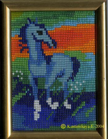 Ну вооот… и всё в том же моём, перво-беременном и обильно бисерном году соткала я ей на день рожденья коня по Трауготовскому рисунку. Это, получается, даже до кота, кота-то я уже на сносях плела. И ездила я с этим конём в багетную мастерскую куда-то на другой конец Москвы, и делали мне там крошечную рамку чуть ли не неделю за непроизносимые деньги. Но результат Катьку мою порадовал настолько, что уже 18 лет стоит на видном месте.