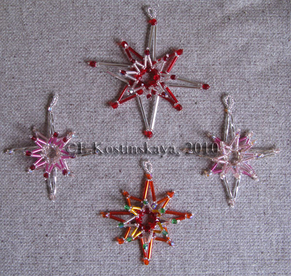 Всё в том же, феноменально урожайном на бисерные работы, 2006 году наплела я какое-то нереальное количество звёздочек для предновогодних ярмарок. Больше шестидесяти — это точно. Цветного стекляруса сильно большой длины было не так чтобы шибко разнообразно (ну там, золотой, серебряный, красный, синий, аметистовый, коричневый), но бусин-то крупных разноцветных сколько!