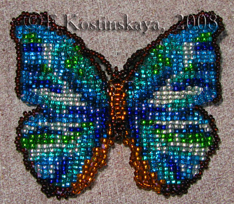 В 2001 году я плела его по детской энциклопедии, срисоввывая с рисунка. В 2008 решила соткать, срисовывая с фотографии. На сей раз не стала отражать разность освещения на крыльях, соткала простенько 11 цветов, крылышки одинаковые, тельце объёмное (квадратный шнур)