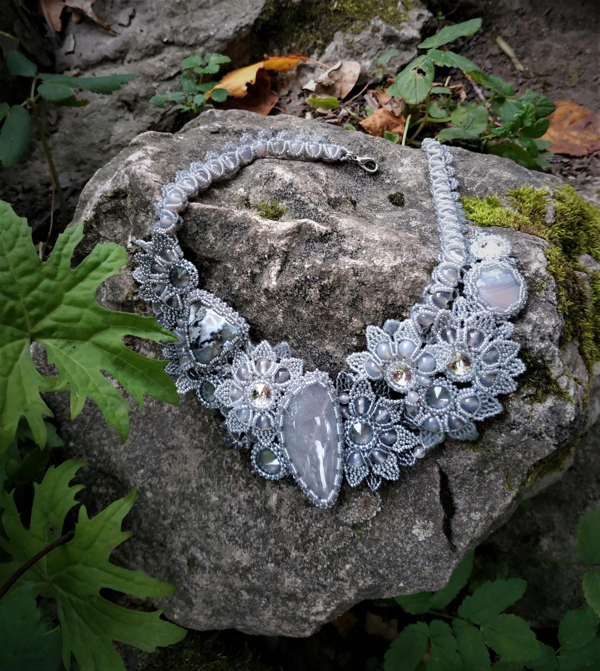 … Украшения у меня чаще всего бывают двух видов — сконструированные и выращенные. Здесь как раз второй случай, и случай практически клинический: первый робкий росток как я тогда думала кулона появился в конце 2016 — солнечный камушек с чудесной иризацией и один цветочек… еще один… Вскоре стало ясно, что кулоном не обойтись, и будущее колье отправилось в коробку с недоделками — вылеживаться. Периодически доставалось, крутилось так и этак… Тон задавали два камня: к солнечнику в компанию напросился треугольный агат, эта парочка и продиктовала основную идею всего этого безобразия. Агат должен был олицетворять вечный питерский дождь, солнечный камень — не менее питерские солнечные деньки. Такое уж у нас солнышко и такая погода в целом, оттенки могут отличаться, но цветовая гамма будет неизменно серой. Даже рабочее название придумалось — «Прогноз погоды». К концу 18 года я его даже доплела. Агатовые бусины искала по всему дому (а не надо было давать Лидушке их драконить), здесь покрупнее, там — несколько совсем маленьких, каплями дождя на лепестках — кварцевые сколы, мелкими лужицами — риволи и еще один маленький агат, в котором отражался робкий рассвет — тоже, разумеется, питерский.