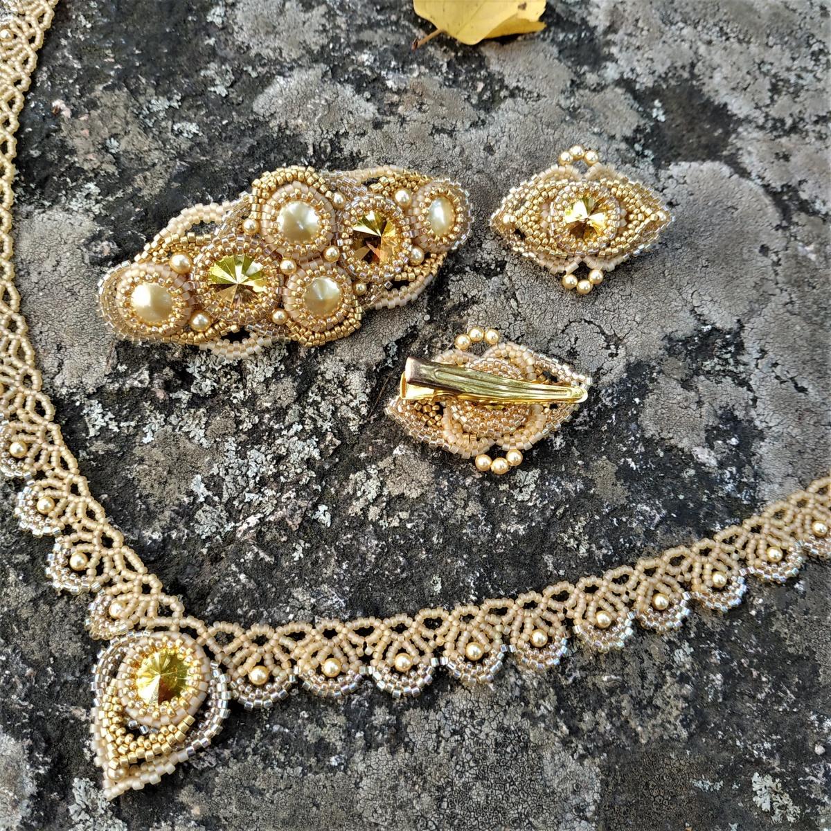 В составе комплекта — маленькая заколка на филигранной основе (годится, чтобы закалывать часть волос), две заколки-крокодильчика (там в основе находка века — зажим-«крокодильчик» с вогнутым ситечком, я скупила все, что было в «Мелодии бисера» на эту тему и еще планирую поискать на алиэкспрессе) и «серийное» мини-колье.