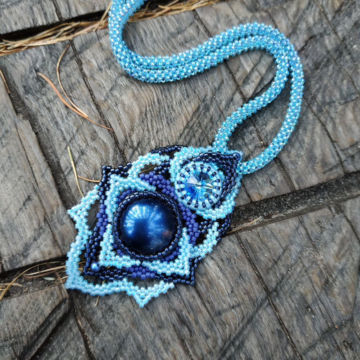 Есть у Лиды сине-голубое платье… какое-то оно непростое. Атлас, сверху фатин, потом еще тёмно-синий гипюр с пайетками. Атлас и фатин немного отличаются по оттенку, и первая попытка подобрать ко всему этому великолепию украшение потерпела фиаско: голубой бисер оказался немного не того тона. Просто к тёмно-синему а-ля школьная форма пойдёт, а для Лидиного платья будет еще второе и третье приближение, а может быть и четвертое с пятым. Лиха беда начало) Пока же имеем кулон, который пойдёт кому-нибудь на подарок.