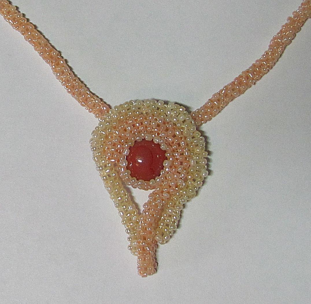 Это колье для меня, как талисман, потому что с этого камешка у меня и началось увлечение бисером. Конечно не совсем с него, я плела лет в 15-ть, но потом забросила. Камушек этот пришёл ко мне сам — нашла его на терраске, откуда он взялся — не знаю. Сначала он был вплетён в тайваньскую Златку