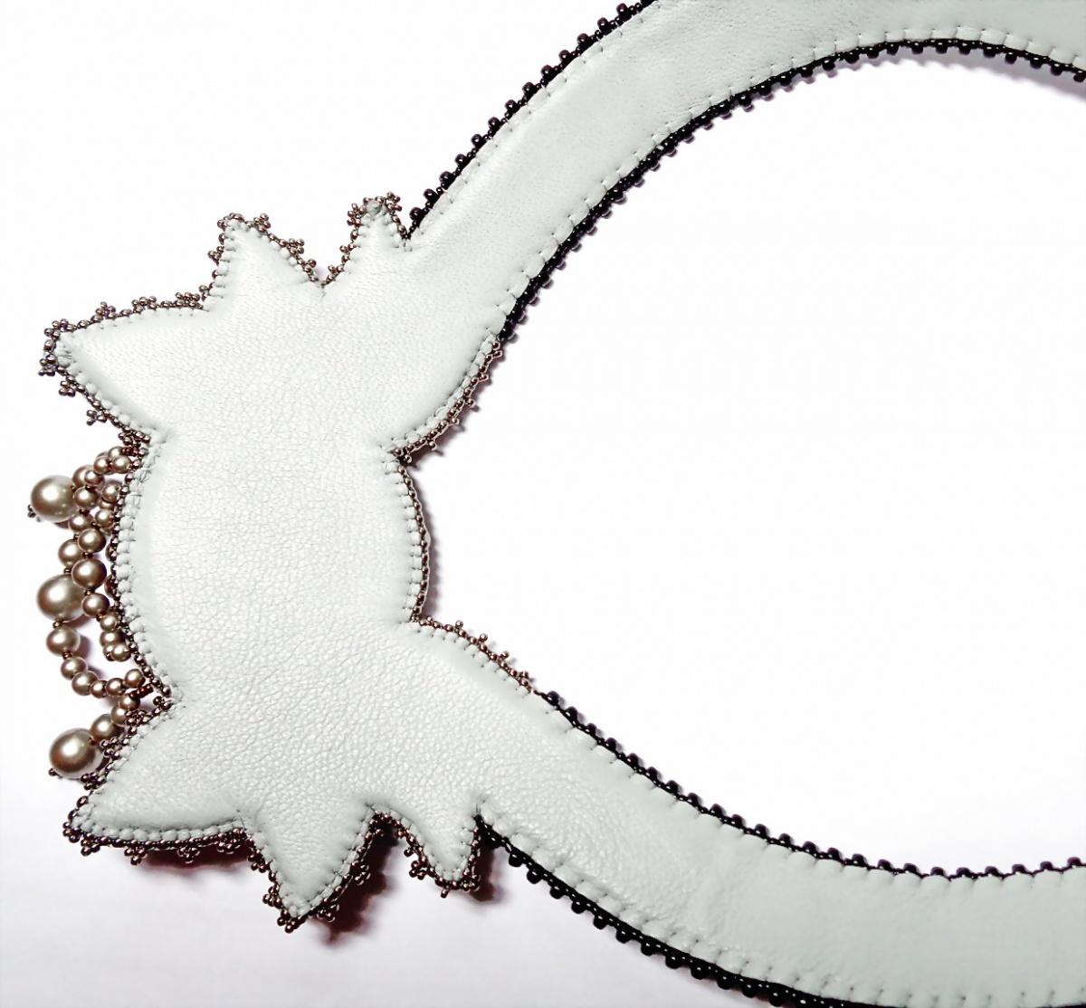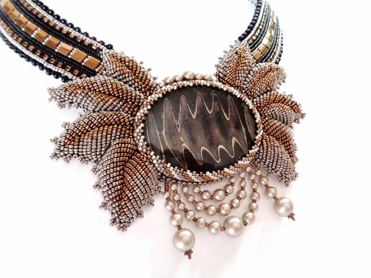 После затяжного творческого кризиса родилось такое)) Долго лежал кабошон симбирцита с аммолитом, наконец пристроился. Вышивка объемная по настилу. Цвет черный-бронза-сталь, жемчуг Сваровски платина, а фотограф я никудышный)))