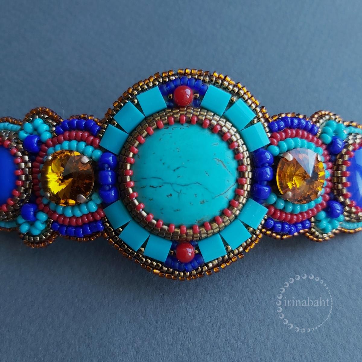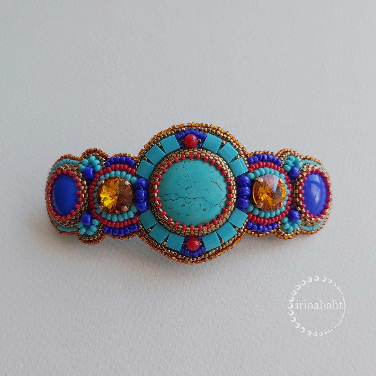 Заколка с кабошонами говлита, с кристаллами sваровски, синие кабошоны из старой заколки, которые до этого были серёжками. Немного придушила жабу и пришила тилу. Основа 8 см.
