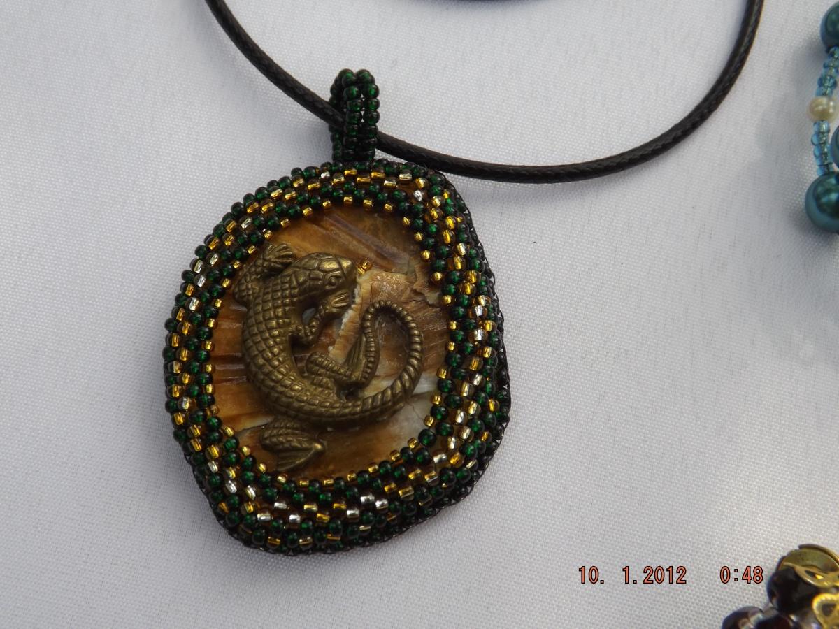 И как раз на камушек идеально просилась ящерка-подвеска. Но жаба зверь страшный, эту истину знают все)), закрывать камушек жалко стало, поэтому второй кулон собран из ракушки (предварительно разбитой) и сверху улеглась ящерица.