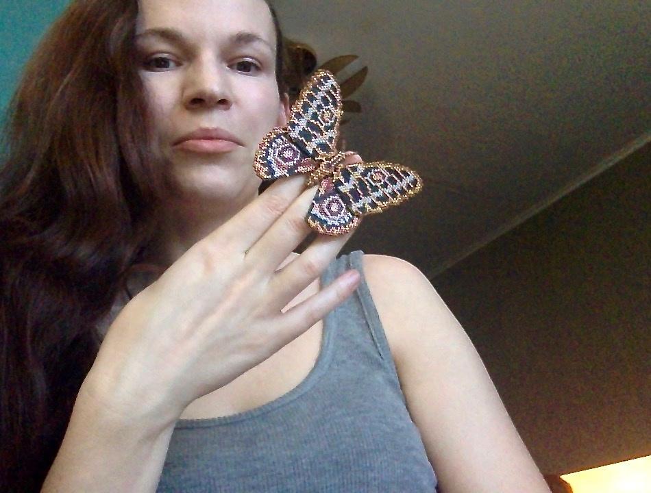 Очень здрассте всем! Доковыряла я таки эту насекомую, собственно — весь мой забег по бабочкам начался с неё, давно-давно увидела схему этой королевны и поняла что если не сплету — то будет мне сильно некомфортно ))) По этому поводу был совершён набег на Сокол, куплено там пятнашки тонна (а иначе смысл на Сокол ехать ) и — отложилось мероприятие это на пару лет… Наконец — созрела, на маленьких насекомых руку набила (вроде бы) и вот — она есть у меня! Ура товарищи!!! Далее — как обычно, мильён почти одинаковых фоток )))