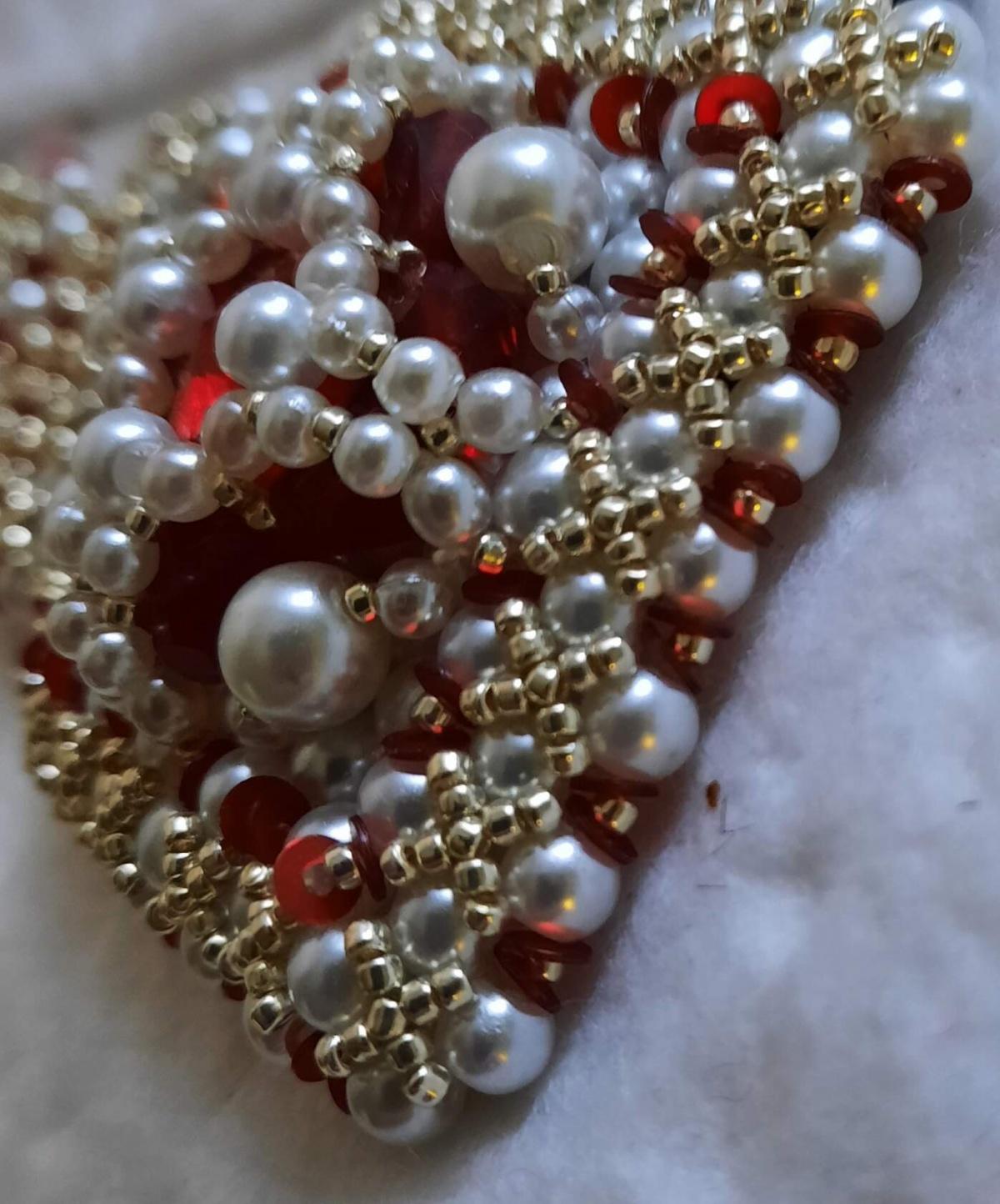 Выводим иголку в бисерину отмеченую синим. Набираем жемчужину 2мм., пятнашку, ещё жемчужину2мм и пятнашку