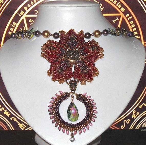А цветочек — берёшь схему цветочек с риволькой в центре. Начинаешь плести лепестки. три строго по схеме два не сшив и расшив словно они раскрыты. Сшиваешь снова по схеме. В центр прикладываешь пуговицу ТьераК. Пока просто для виду, не закрепляя. Берётся два штифта самых длинных гвоздики. На них надеваются черепушки и вставляются в полураскрытые лепестки. на кончиках штифтов, за петельку, пуговку крепим в серединке цветка. Расшиваем серединки лепестков как в душу ляжет