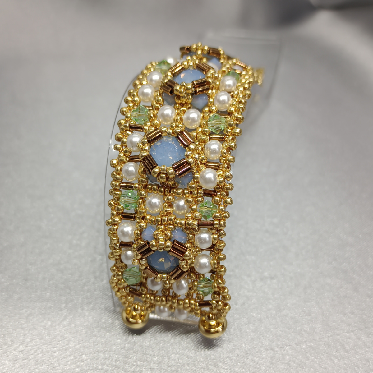 Спасибо! В хорошем оффлайн-магазине подобрать не сложно: два цвета биконусов и шатоны в цвет одного из цветов биконусов. Схема тоже простая. Труднее всего было запихать шатон под стеклярус, чтобы не вываливался. Ношу пока сама, проверяю на прочность))