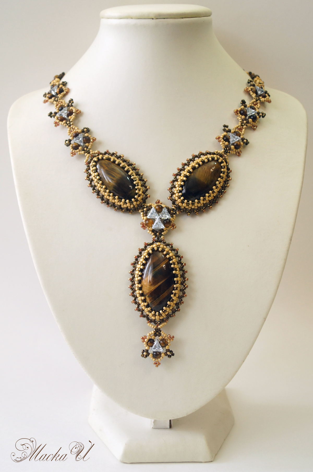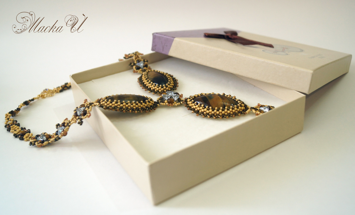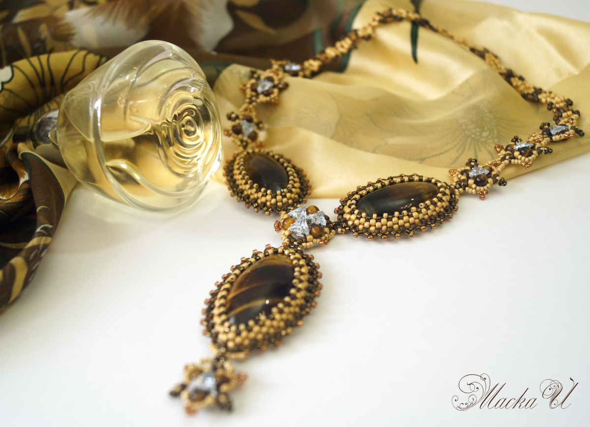 Колье с тигровым глазом, японским бисером и фианитами. Пока без названия. Сделан в подарок племяннице мужа на 20 лет. Камни выбирала свекровь. Не хотелось делать вышивку для молодой девушки с такими камнями, мне показалось тяжеловато. Сделала плетеное, ажурное.
