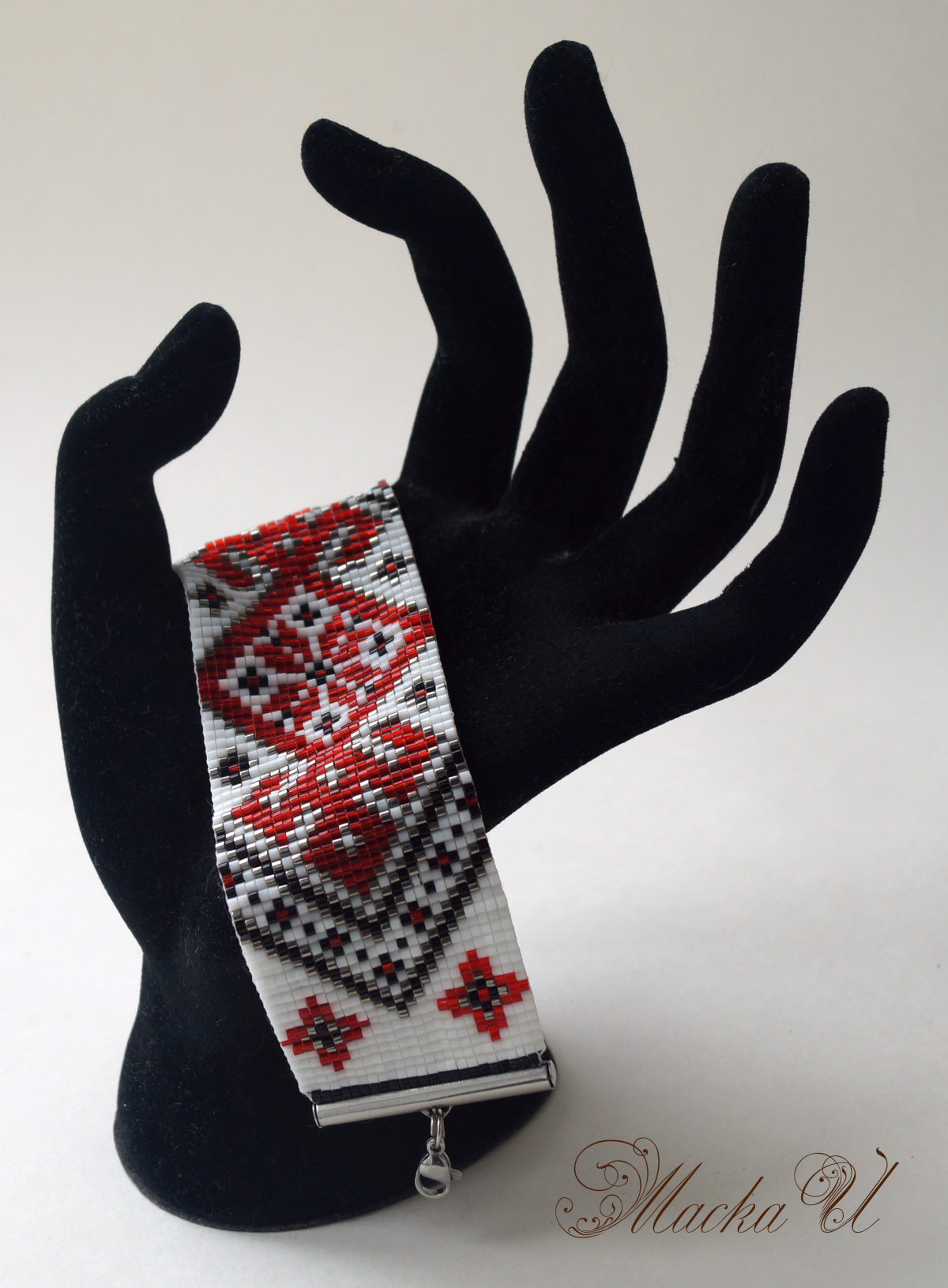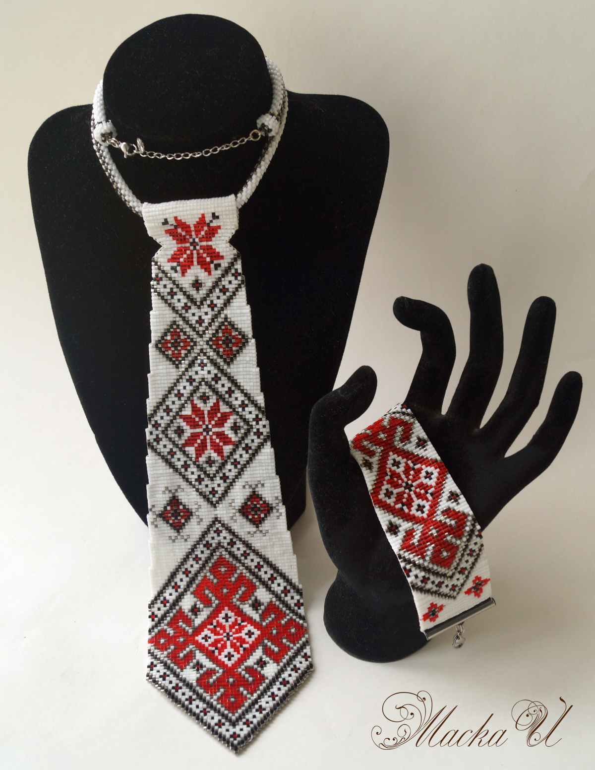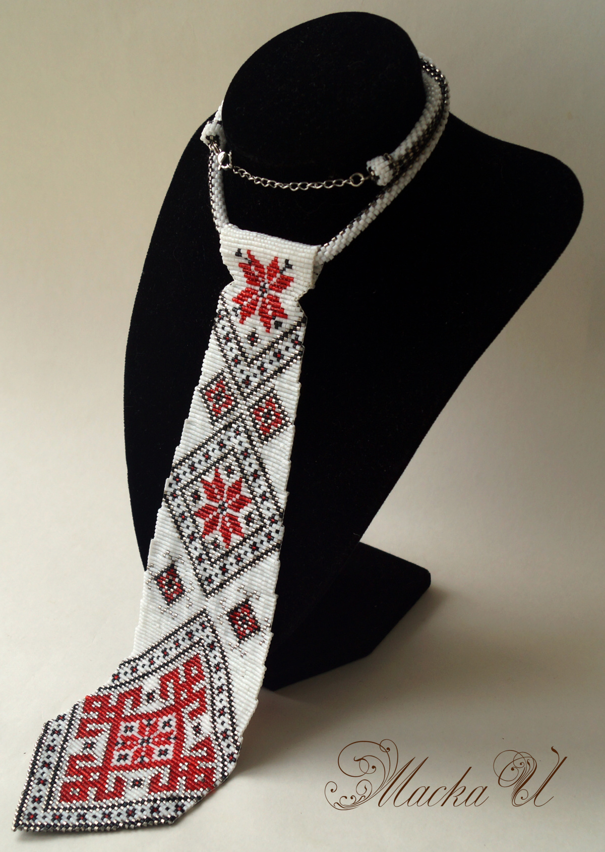 Галстук и браслет опять с мордовскими мотивами. На этот раз из китайца. Первый большой проект на станке. Сначала хотела ручным ткачеством, получалось ровнее и однороднее полотно, но с этим бисером получалось как бы с ворсом. Когда гладишь «против шерсти» чувствуются края бисера. И блеск бисера как бы сглаживался под прямым углом. Решила переделать на станке. Браслет вроде ничего получился, а галстук в местах наращивания рядов с выпуклостями. Короче не идеально, но приемлемо. Схему нашла в пинтересте, автор не указан. Там был гердан. Переделала под себя. Подвес у галстука вязанный жгутик.
