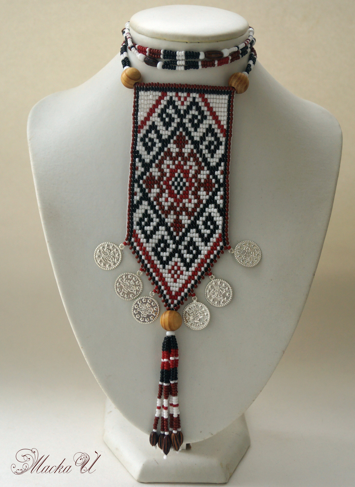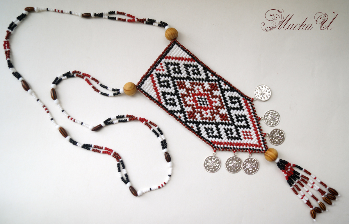 Этнический кулончик, опять с мордовскими узорами. Опять же в пинтересте нашла интересное оформление кулона, решила что то подобное изобразить. Станочное плетение чехом, деревянные бусины и еще нашла старинные мамины бусы из каких то семян. Если кто знает как называются, подскажите. Ну и монетки вместо бахромы. В живую мне больше нравиться, чем на фото получилось, думаю, может себе оставить.
