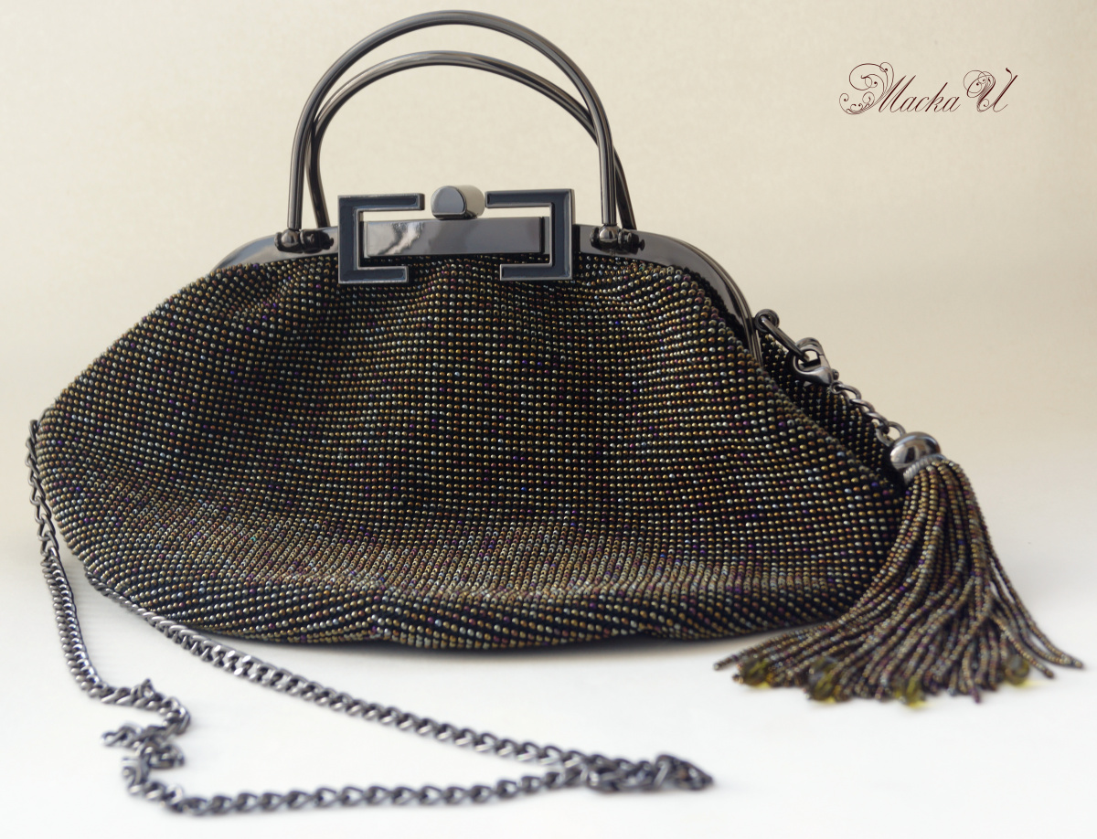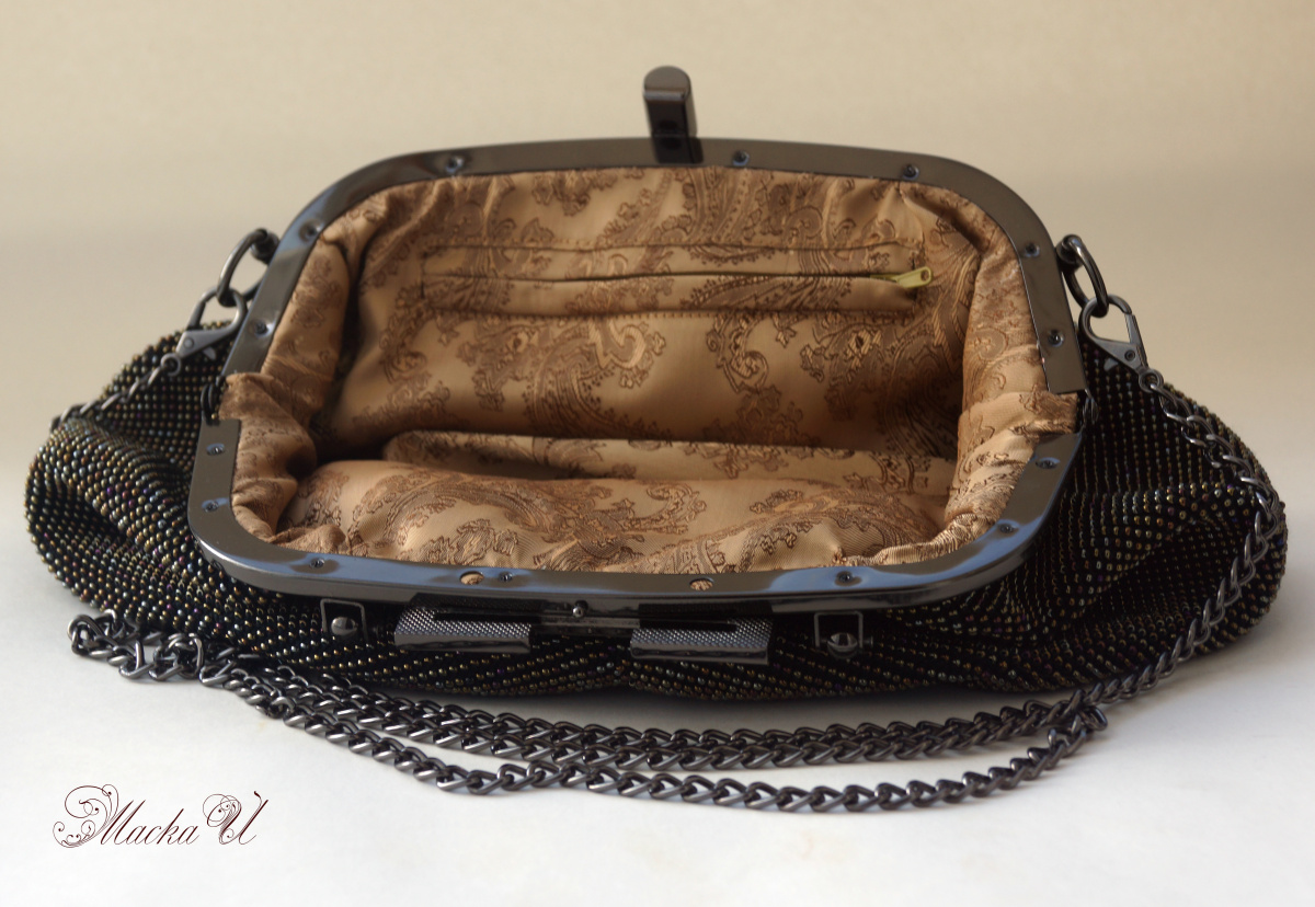 Ну еще сумочка шик №6. Не стала отдельно создавать страницу, т.к. у меня уже их куча похожих. Фермуар такой у меня уже был, только золотой, а тут черный и длинная ручка не вязанная, а цепочкой. Внутри кармашек на замке.