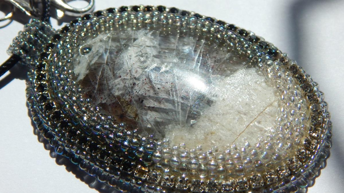 Первоначальная идея, в принципе, не поменялась. Я и собиралась сделать предельно минималистичный кулон, только если раньше с цветами бисера был затык, несмотря на имеющуюся в наличии всю гамму серых оттенков тохо, то теперь камушек шустро выбрал прозрачный и серый радужный бисер и прихватил за компанию стразовую ленточку тех же цветов. Поскольку задача оплетки — максимально не отсвечивать, даже на стяжке использовала эти цвета бисера, хотя обычно беру контрастный. А белый сектор на обшивке края больше потому, что это такая аффтарская задумка, а не потому, что серый бисер ушел до последней бисеринки