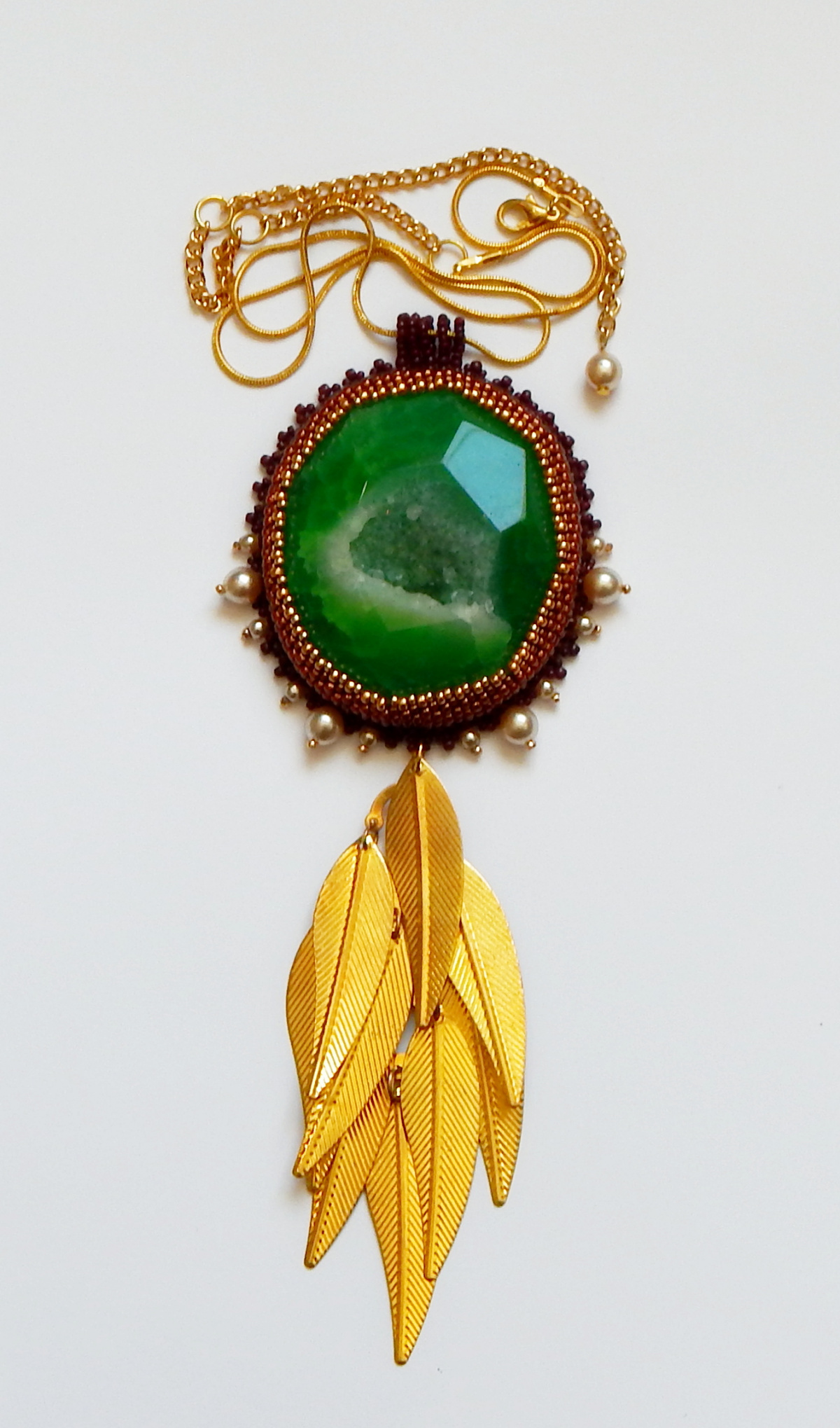 Вот он, главный засранец последнего времени))) Всю кровь выпил. Вытащила ради него половину сокровищницы, где теперь время взять, чтоб обратно все по местам разложить… Задумка была вообще другая. К этому золотистому хвосту должны были спускаться мозаичные дуги, постепенно увеличивающиеся в размере. Не захотел. С десяток других вариантов примеряла — все распороть пришлось. А что он выбрал? Хвост так и не отдал, вцепился намертво, но каким боком к нему довольно-таки романтические жемчужины???