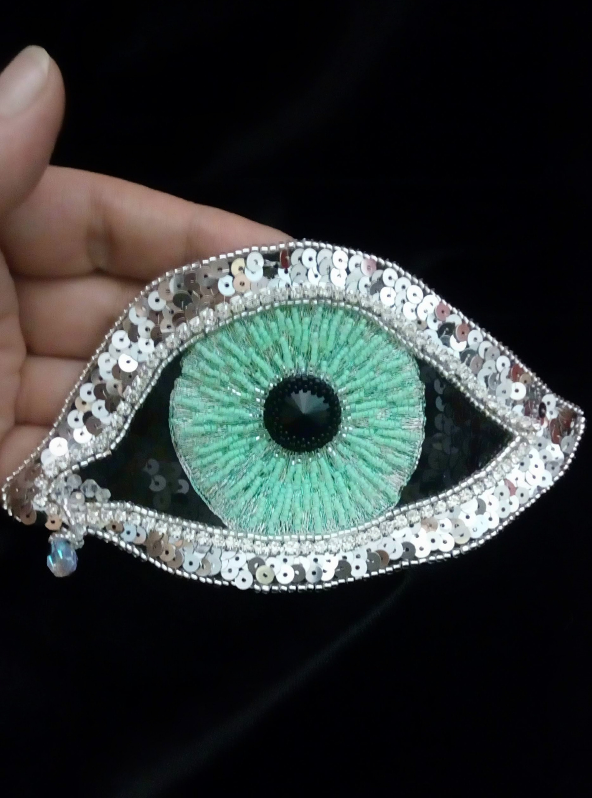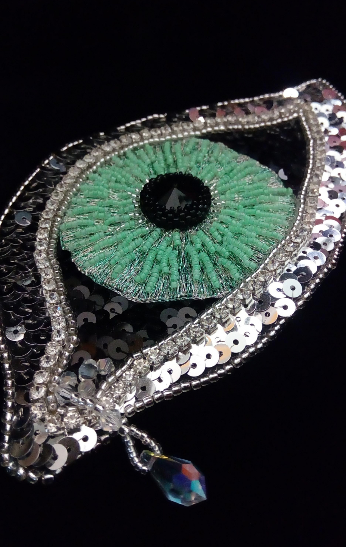 Вышивка люневильским крючком бисером, пайетками на шёлковой органзе, оплетеный риволи, подвеска…