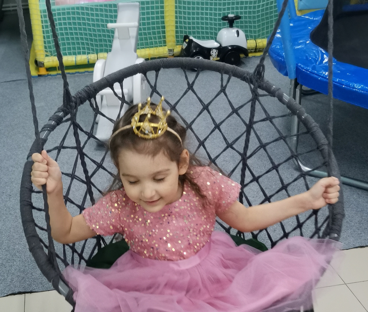 Дальше она, в самом начале, практически, навернулась таки с этого висячего кресла