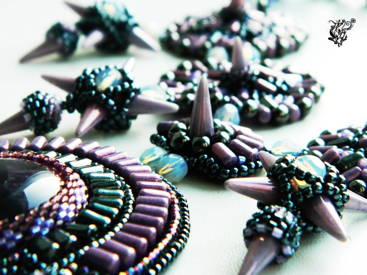 В украшении использованы шипы Spikes и цилиндрики Rulla цвета Luster Metalic/Amethyst и Hematite, а также японский бисер, чешские бусины, кабошон аметиста, натуральная кожа. Цепочка из целиндриров позволяет регулировать длину, в чем помогает универсальный двойной бисерный тогл.
