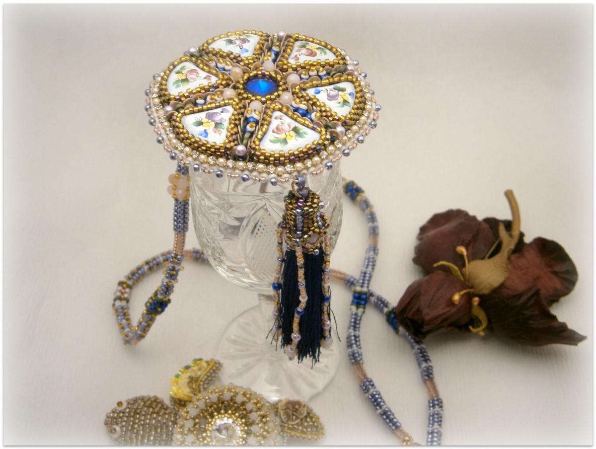 Участие принимали: Финифть вставочки, бисер сплошь японский- делика, тохо, бусинки гранёные чешские, бусины о-ринг двух размеров, пайетки итальянские и)))) барабанная дробь — Риволина китайская, стразовая лента тож, бусины под жемчуг тож, замочек магнитный тож. И кисточка!   Зато ручки родные, русские.