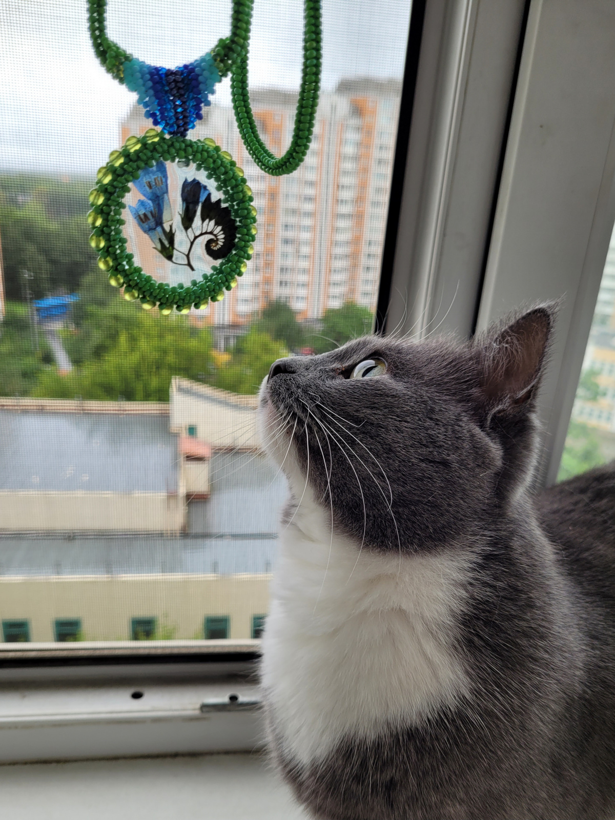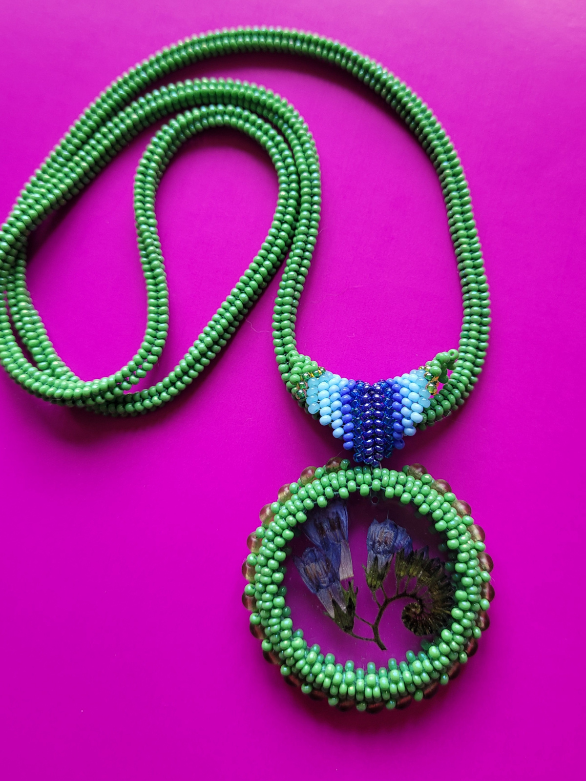 Очаровательный кулончик. Особенно на просвет хорош — потому что видно, откуда синий цвет в бейле. Стоило бы сфотографировать кулон на белом фоне при ярком свете, чтобы синие лепестки хорошо видно было.