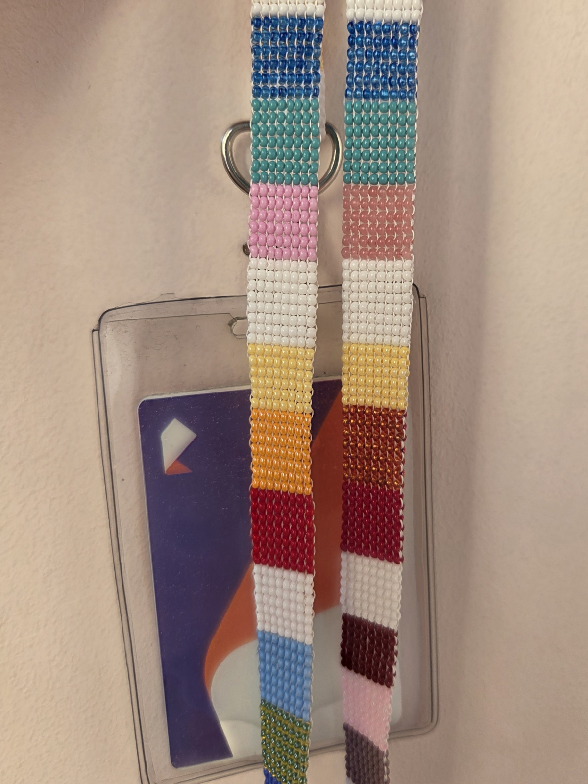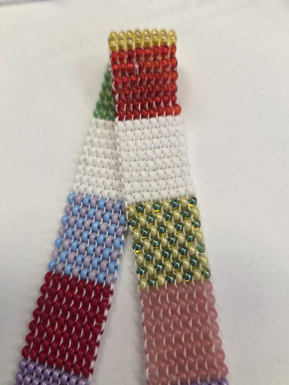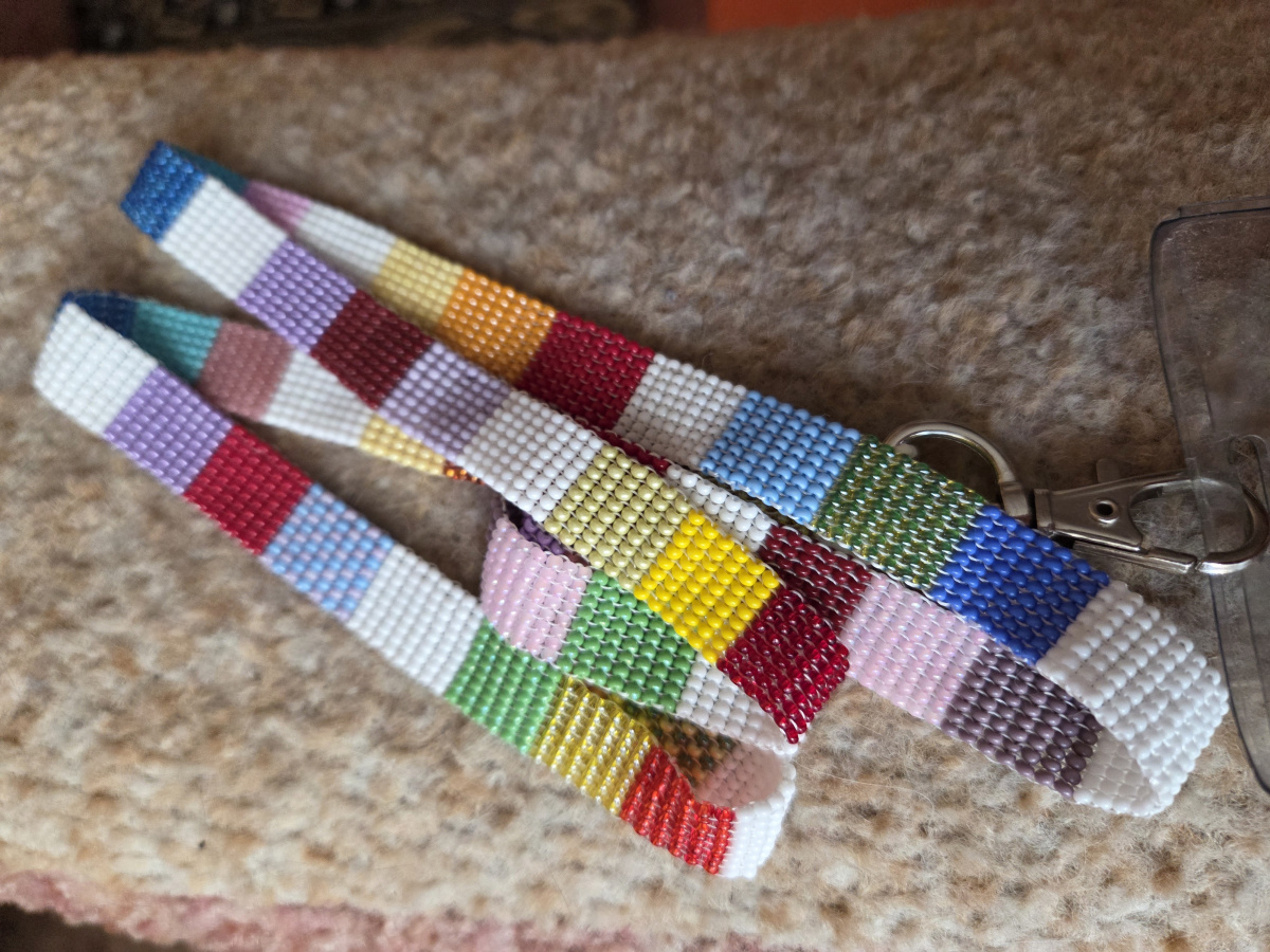 О!!! Вот это да...! Даже слов сразу не подберу)))). Идея супер, а как цвета подобраны — и чистые, и смешанные ( там, где через бисеринку), ну просто восторг! Плетение прямое гобеленовое, выполнено исключительно аккуратно! Мне эта техника очень нравится, она достаточно трудоемкая, полотно получается прочным, гибким, но пластичным. И в качестве ленточки для бейджа — практично, красиво и необычно! А ещё изящно! Тоненькая ленточка из разноцветных квадратиков! Поделитесь, пожалуйста, какую нить использовали и какая получилась длина ленты.