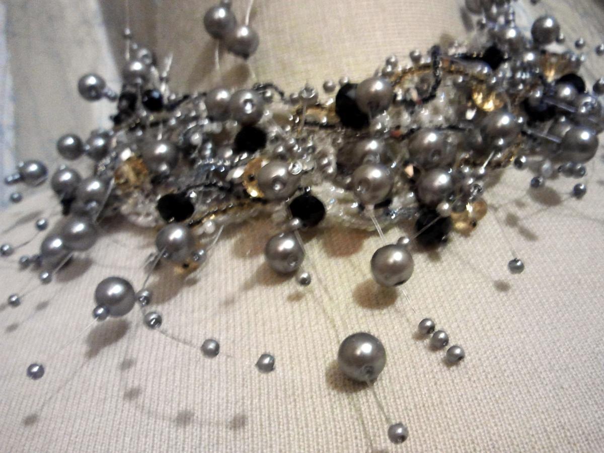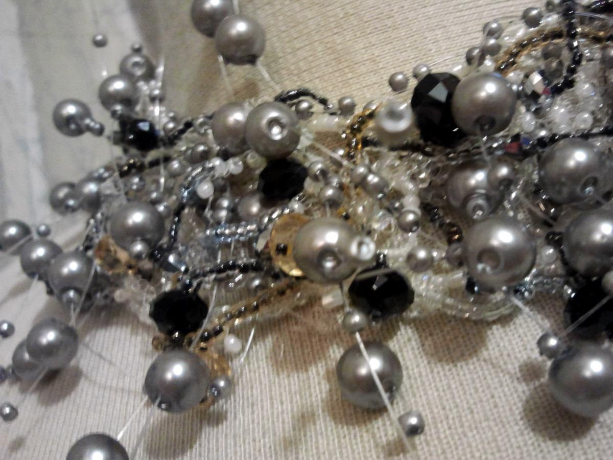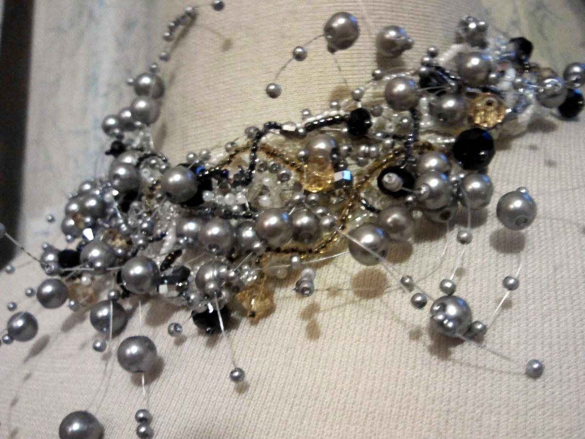 Я купила украшение, в котором бусинки приклеены к толстой леске. Порезала на фрагменты и пришила к сетке из бисера. Добавила разных красивостей и обрадовала дочку на ее день рождения.