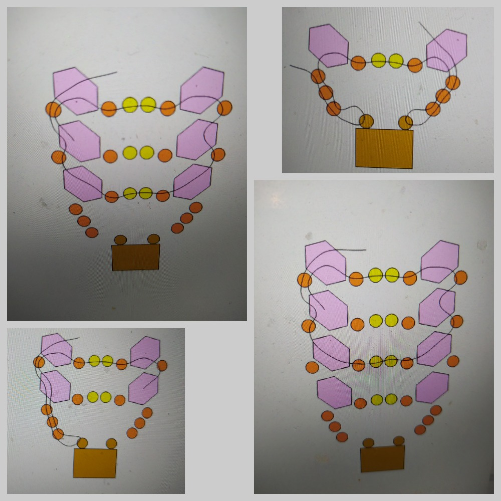 Первый этаж мы приплетаем к застежке. Следующие этажи приплетаются к красным бусинам, т.е. нитка выходит из одной бусины, а ныряет в другую (как в ндебеле). Пока все понятно. Сложность состоит в том, как перейти на следующий этаж (как в ндебеле). Приплетая второй этаж, мне пришлось опуститься до застежки, у вас могут быть другие решения.