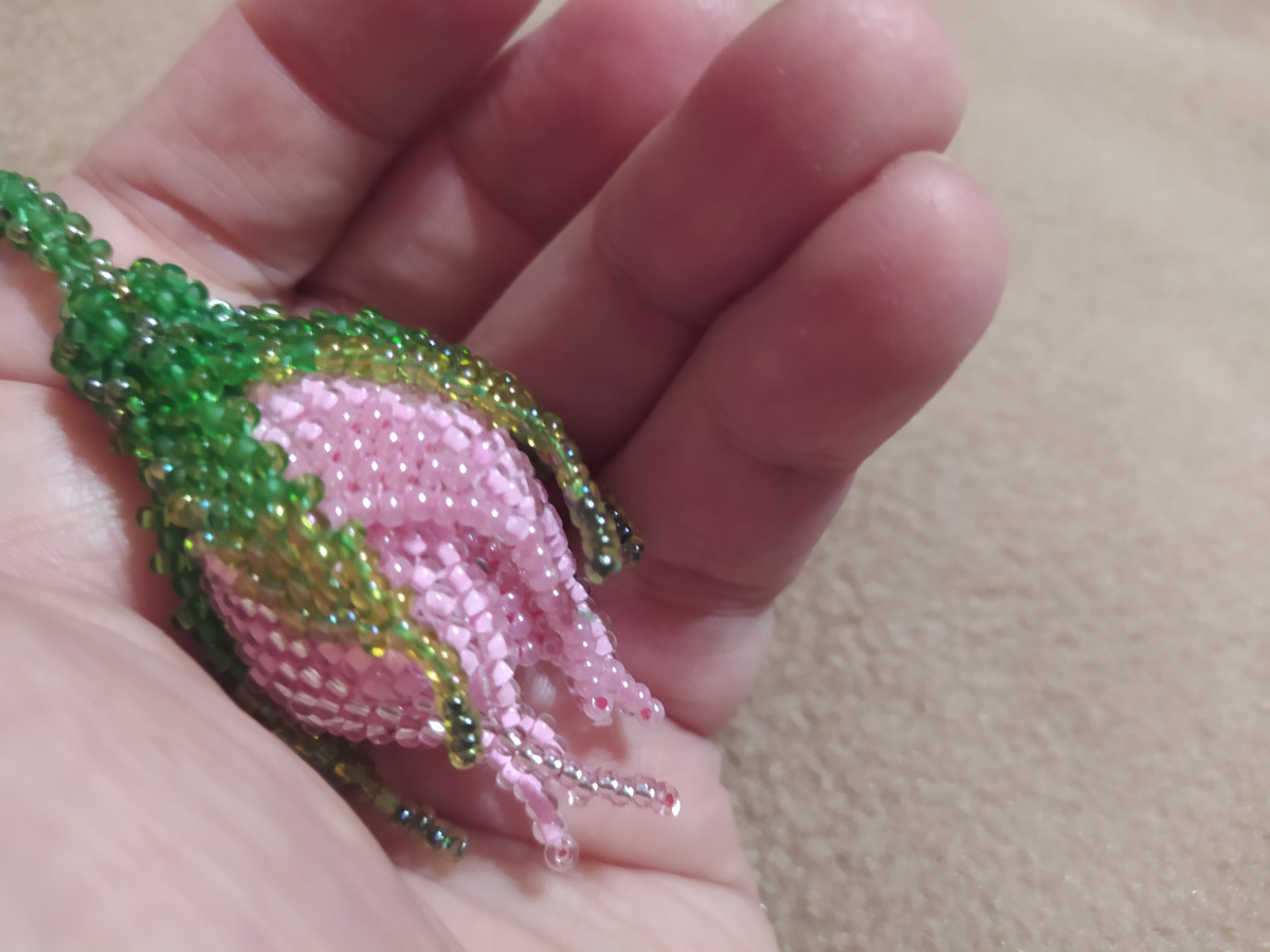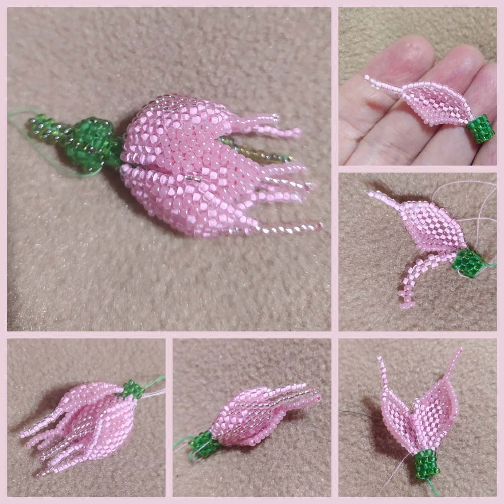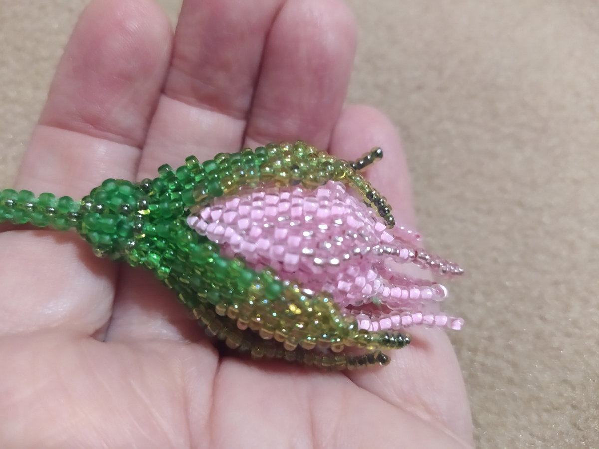Последний снимок внизу поясняет, что следующие три лепестка плетутся из бисерин второго ряда. У нашего бутончика шесть лепестков.