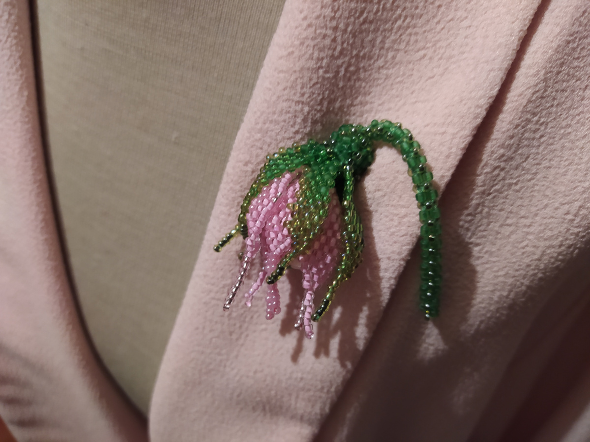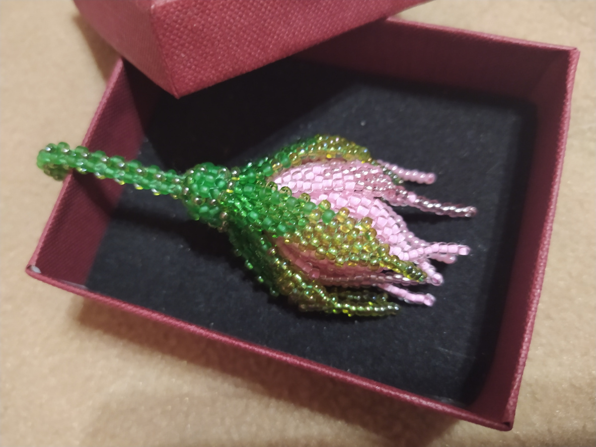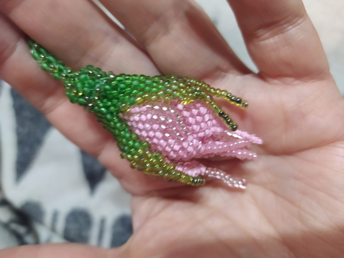 Последний снимок внизу поясняет, что следующие три лепестка плетутся из бисерин второго ряда. У нашего бутончика шесть лепестков.