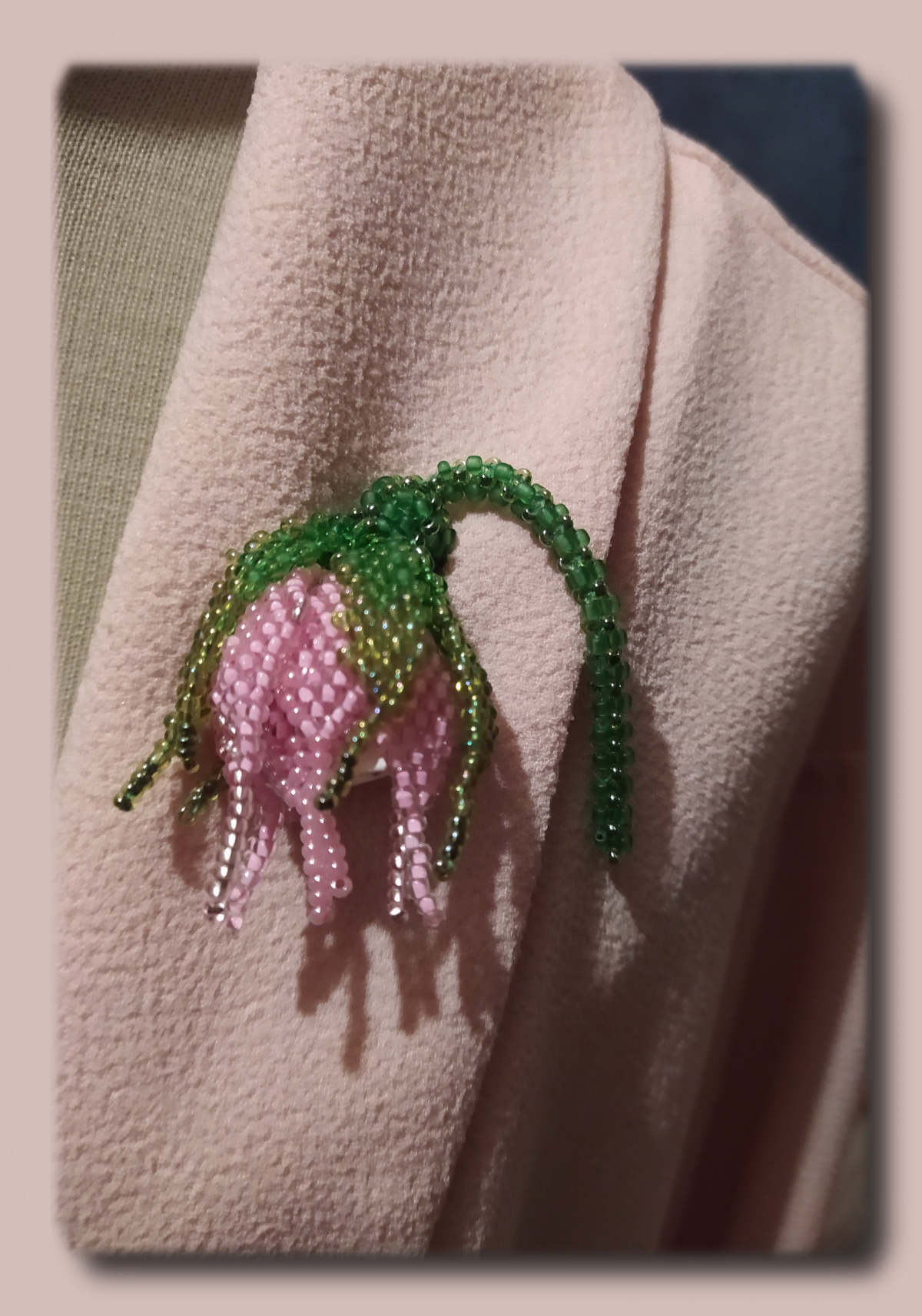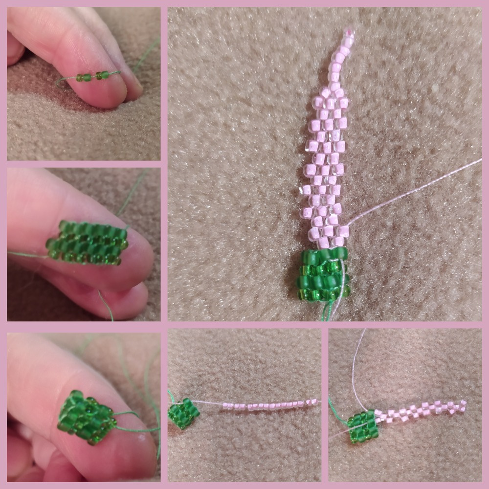 Легко сплели часть жгута, первые три снимка, теперь плетем лепесток. Выводим розовую нить из любой верхней бисерины, набираем четное (у меня 16) количество бисерин и плетем мозаикой. В конце заходим в рядом стоящую бисеринку.