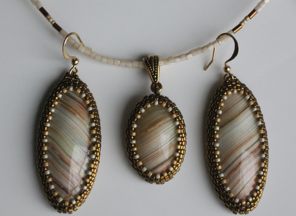 Захотелось серьги помассивнее и без наворотов, ну люблю я такие, к костюму подошли 3 обалденных оникса, в результате общая длина серег 6см, а кулончик маленький, но он никак не хотел вышиваться на коже, поэтому таким и остался.