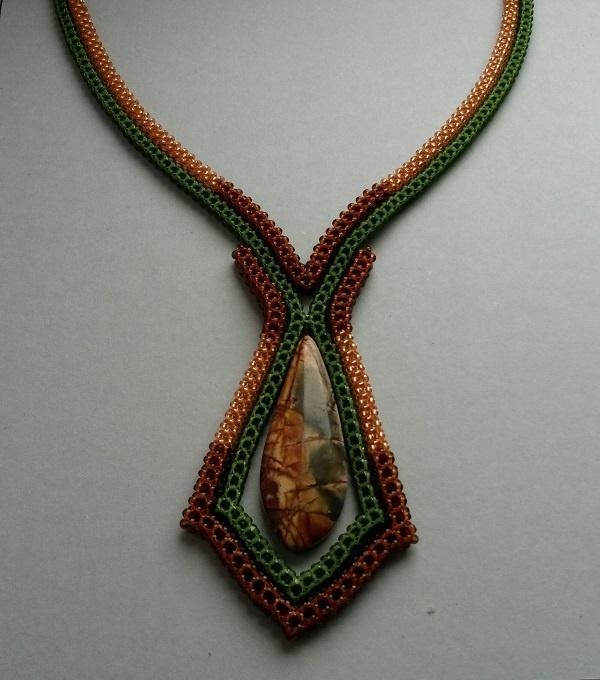 Увидела кулон Татьяны Плесовских — и просто заболела! До того захотела и себе такой же, что даже купила на выставке минералов подходящей формы яшму. И в совместной закупке оказался Тохо чудного «болотного» цвета. Правда, не оказалось терракотового — ни у кого из немецких и чешских продавцов. Кроме одного, который тут же взвинтил цену на него с 70 центов до 3.5 € (монополист проклятый!) за 10г. Ничего, отыскала в своих закромах чеха нужных цветов.