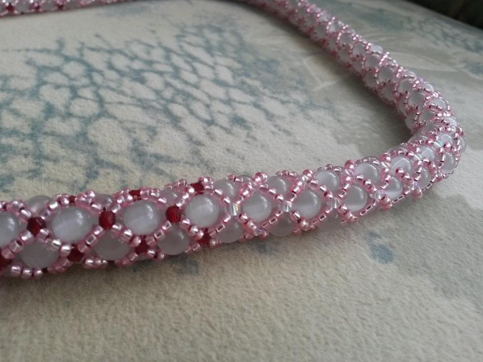 К сожалению, бусинки оказались не такими ярко-серыми, как мне показалось на фото магазина. И чешских гранатовых бусинок хватило только на половину жгута… Но я все равно довольна результатом!