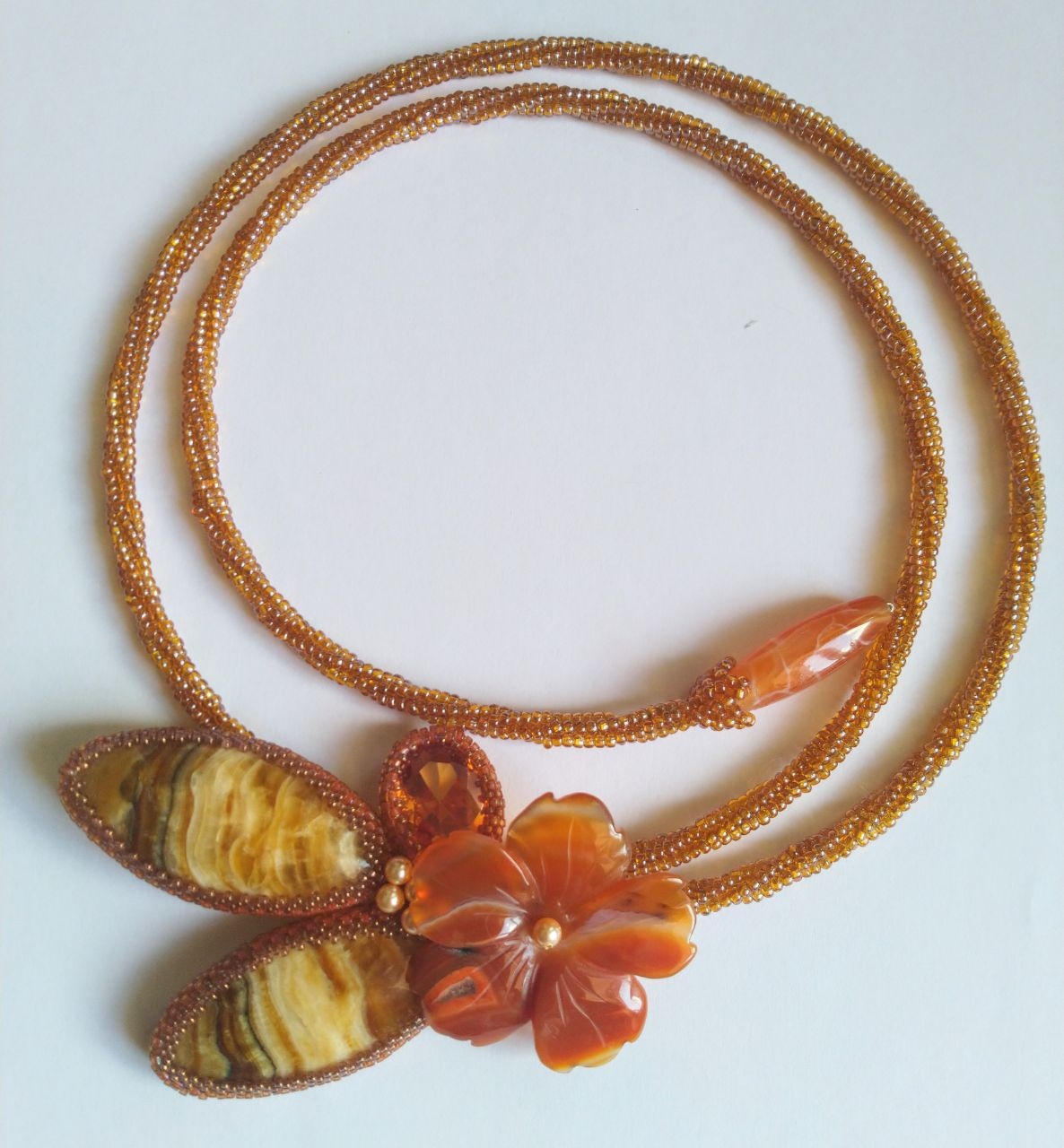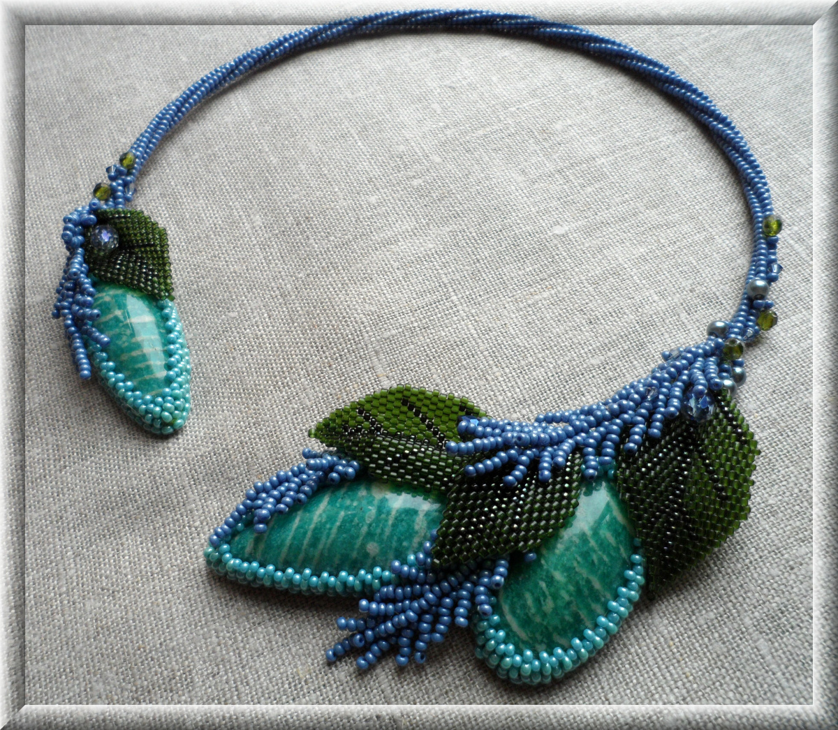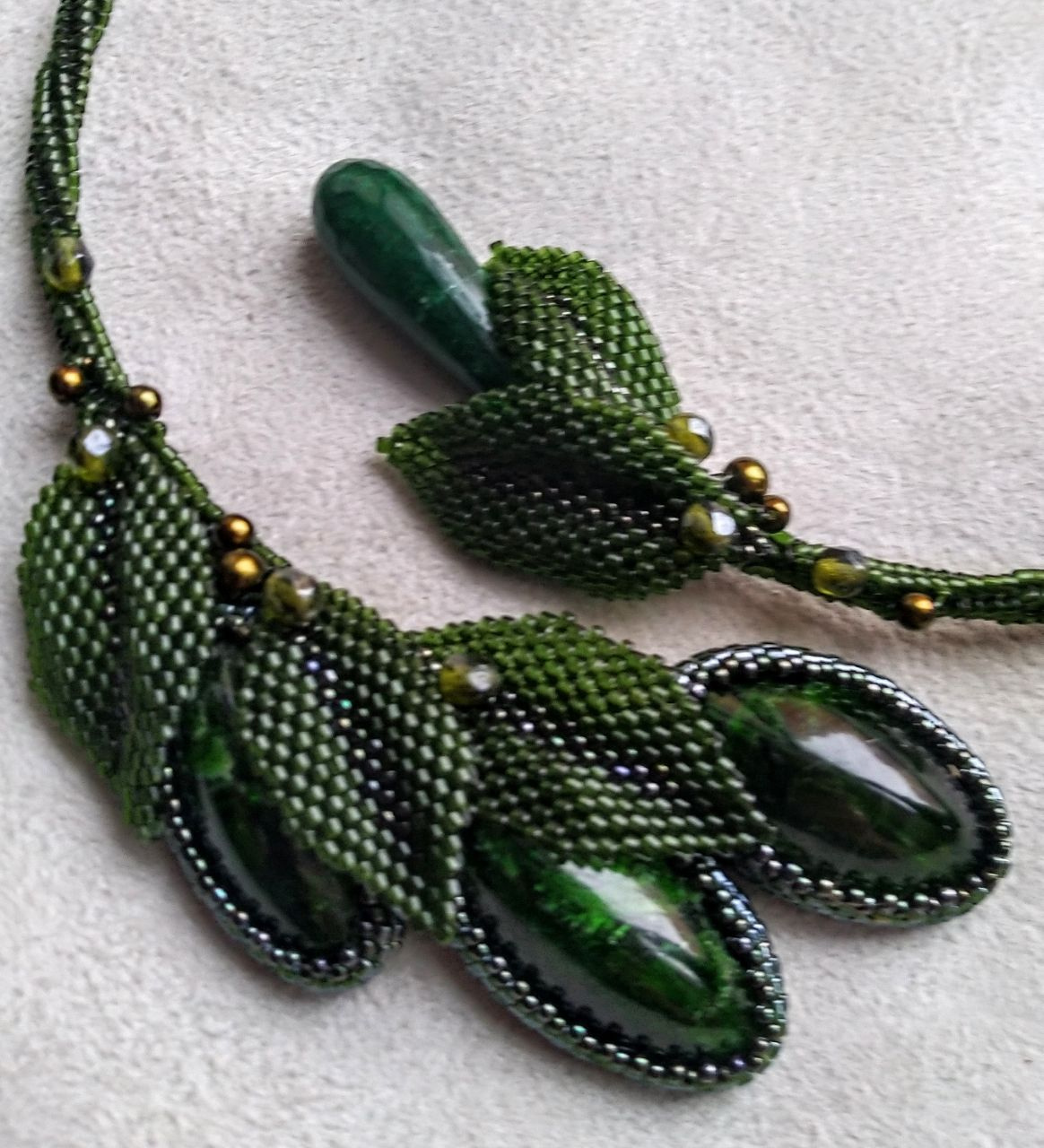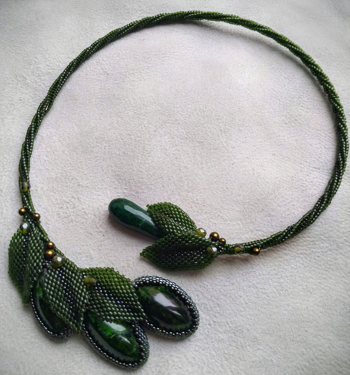 Незамкнутое колье «Лес Итури». Хромдиопсиды, чешские бусины и жемчуг, японский бисер. Капля — каллорированный агат. Хорошо держит форму благодаря мемори проволоки. Подходит на любой обхват шеи.