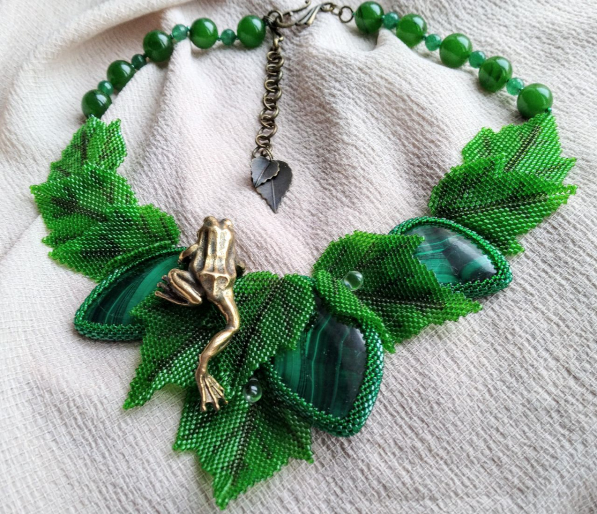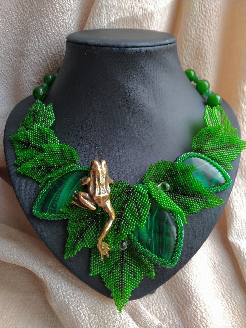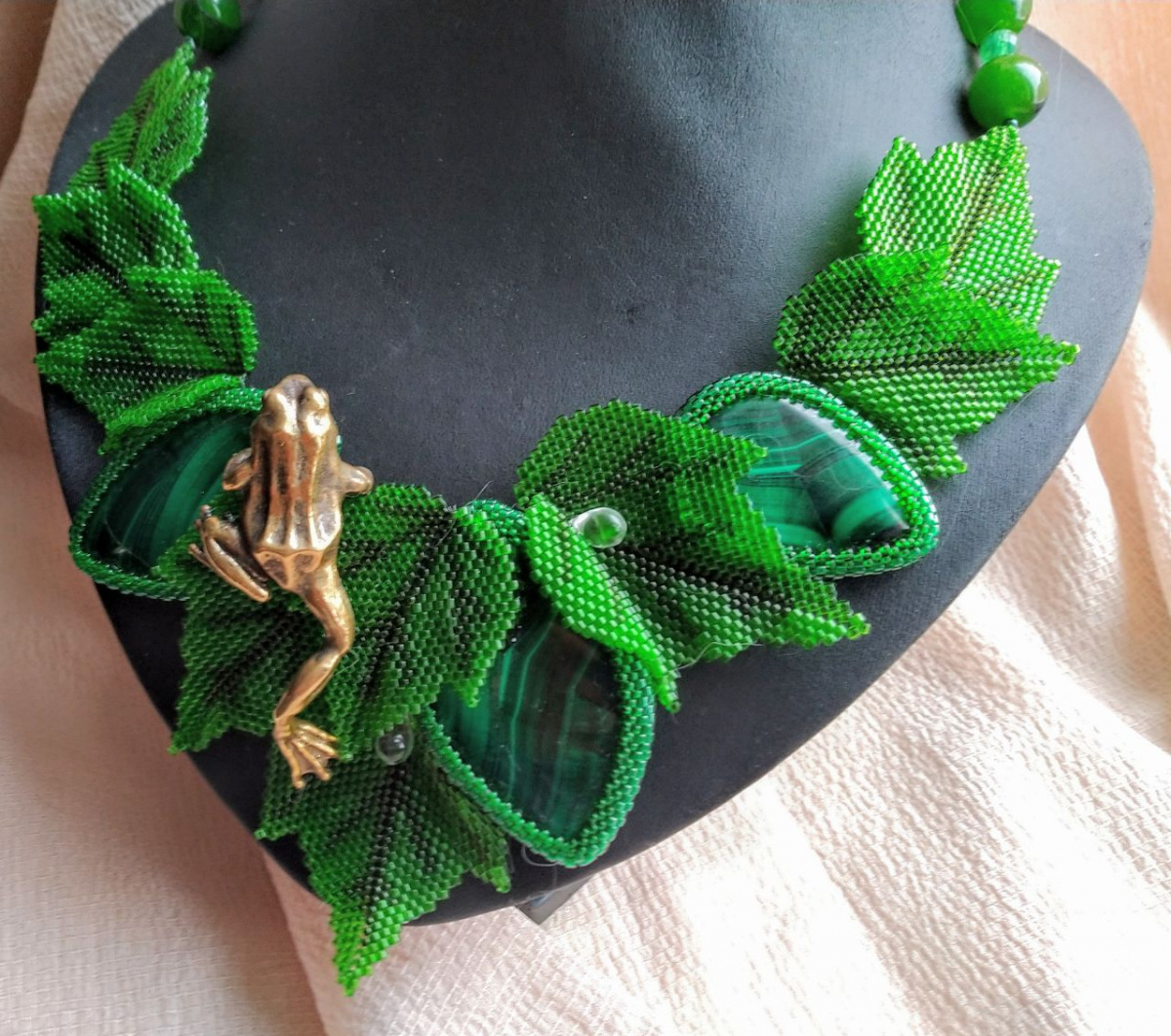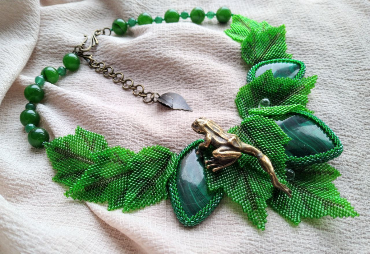 Колье получилось уникальным из за малахита. Настоящего уральского, с эффектом «кошачьего глаза» На фото, к сожалению очень трудно это передать.