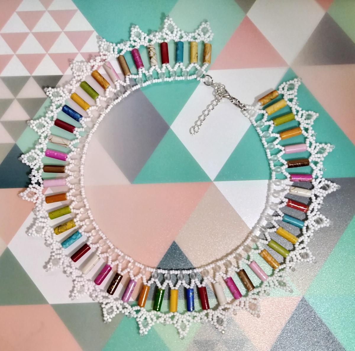 Очень долго не знала куда применить цилиндрические и удлиненные бусины, а тут увидела схему простого колье, и все срослось. И вот уже второе украшение с применением полюбившейся мне схемы