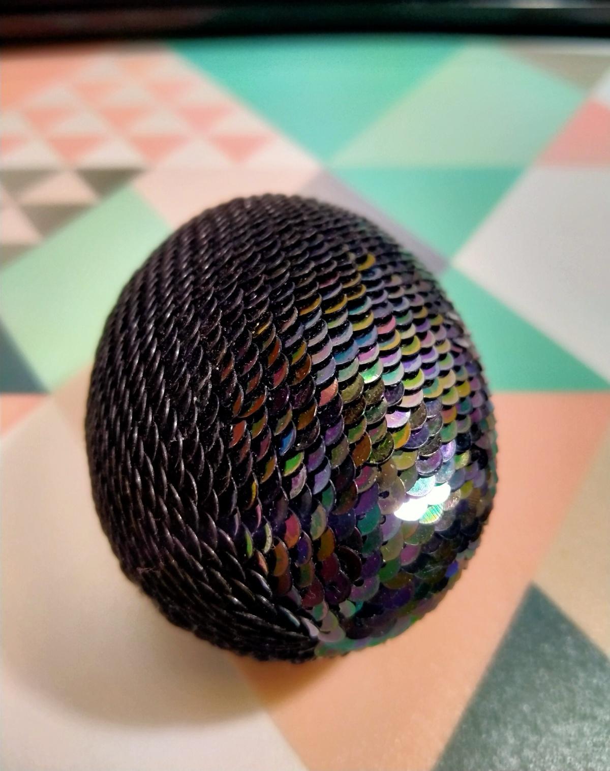 Наконец-то заставила себя повторить связать яйцо из черных пайеток. На этот раз яйцо получилось больше по размеру. Использовалась обычная деревянная заготовка размером 6 см. Результатом осталась довольна