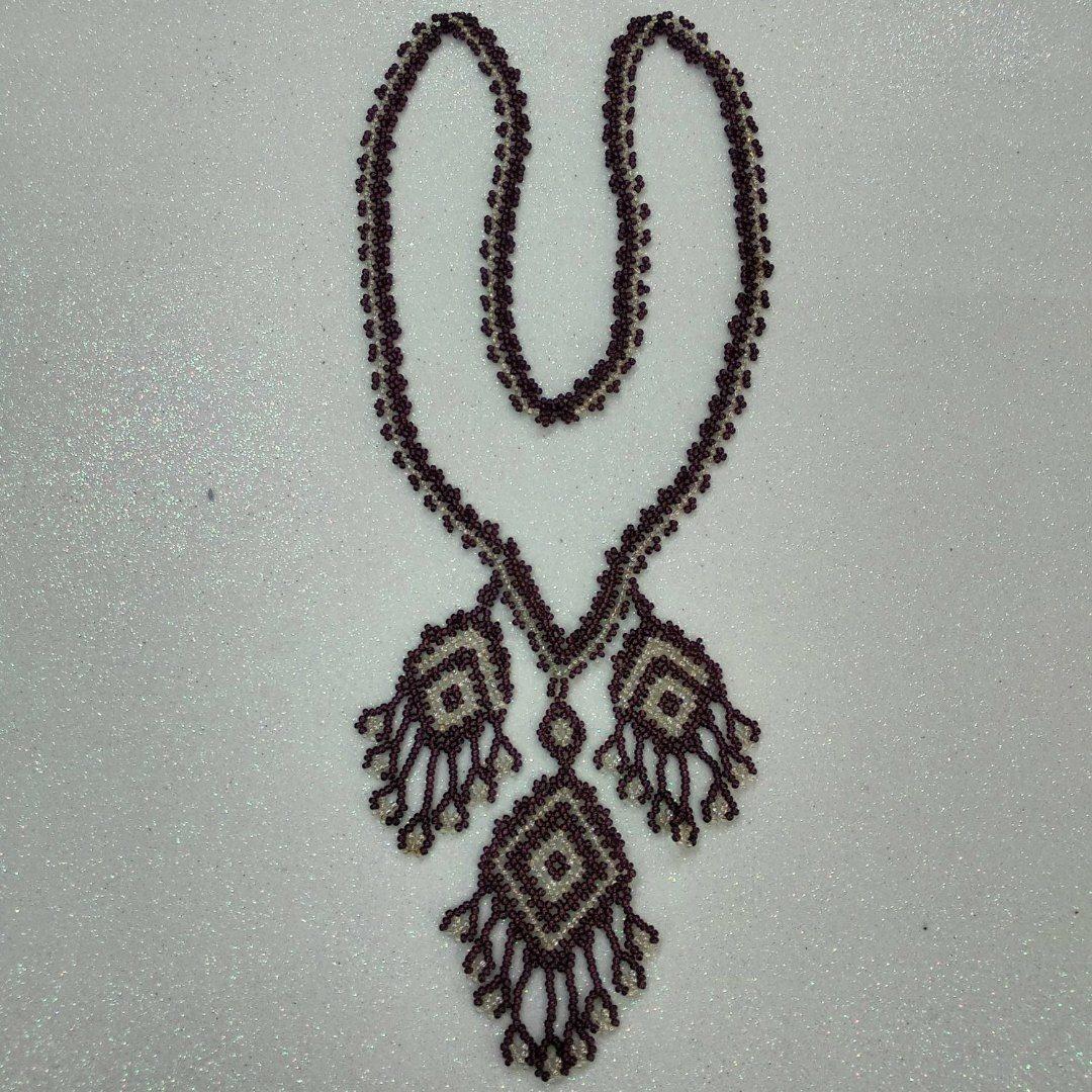 Украшение 1984 года. попалась как-то книжка с фото туркменских ювелирных украшений. Хвостики, квадратики и сочетание цветов заворожили. От цвета отошла, а хвостики полюбила. Техника и формы придумала сама. Интернета еще не было в России. Пособий по бисеру тоже. Только 1 журнал. Сделай сам со схнмами Литвинец и 1 статья в Работнице и Науке и жизнь