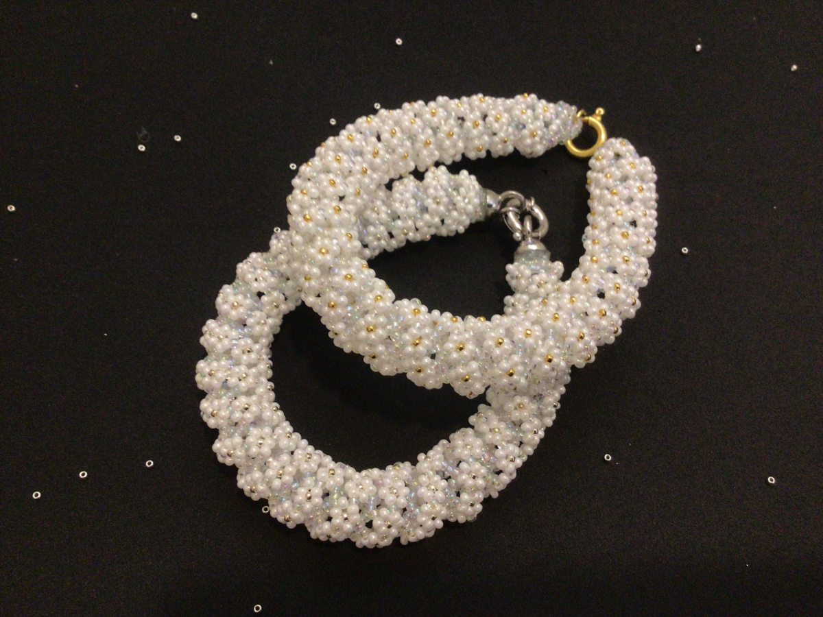 Мне тоже очень понравился шнур с мелкими цветочками. И я как говорится залипла на них. И ещё даже не выбралась. Первым был сделан шнур, который представлю потом. Он, кстати и не очень нравится мне. Поэтому пойдёт в другой раз. Вторым был сделан шнур вот этот почти малинового цвета с золотыми точками. Потом принялась за белый лариат. Который и сейчас лежит неокончен. Потом вижу что время поджимает. А нужно сделать два подарка к Рождеству. Забросила белый. Сделала два браслета. Белых. Себе и нужному человеку. Ну что сказать. Бисер белый чешский десятка Прециоза №46102. Прекрасный снежно-белый цвет более крупный. Фоном к нему прозрачный Миюки №250. Отделка Миюки пятнашка №191. Фурнитура- соответственно золото и серебро. Для себя серебро.